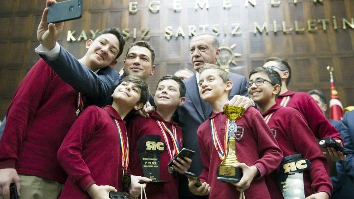 Cumhurbaşkanı ve AK Parti Genel Başkanı Recep Tayyip Erdoğan, Romanya’da düzenlenen 10. Robochallenge Robot Yarışması’nda Mini Sumo Kits kategorisinde Avrupa Şampiyonu olan Manisa’nın Salihli ilçesi Kudret Demir Ortaokulu Robot ve Uzay Teknolojileri Kulübü öğrencileri ile selfie yaptı.Romanya’da düzenlenen Avrupa’nın en büyük robot yarışması özelliğini taşıyan 10. Uluslararası Robochallenge Robot Yarışması’nda Mini Sumo Kits kategorisinde geliştirdikleri ve birbiriyle güreşebilen robotlarla Avrupa şampiyonu olan Salihli Kudret Demir Ortaokulu Robot ve Uzay Teknolojileri Kulübü öğrencileri, AK Parti Manisa Milletvekili İsmail Bilen’in aracılığı ile AK Parti Grup toplantısında Cumhurbaşkanı ve AK Parti Genel Başkanı Recep Tayyip Erdoğan ile buluştu. Grup toplantısında konuşan Cumhurbaşkanı Erdoğan, daha sonra Avrupa Şampiyonu olan Salihli Kudret Demir Ortaokulu Robot ve Uzay Teknolojileri Kulübü öğrencileri ile Okul Müdürü İlker Atalay, Okul Müdür Yardımcısı ve Robotik Eğitmeni Ertuğ Gözaydın ve İlçe Milli Eğitim Müdürü İsa Dilek’i kürsüye çağırarak, başarılarından dolayı tebrik etti.Cumhurbaşkanı Erdoğan, Milli Eğitim Bakanı İsmet Yılmaz, Gençlik ve Spor Bakanı Osman Aşkın Bak, AK Parti Manisa Milletvekilleri Selçuk Özdağ, Recai Berber, İsmail Bilen ve Uğur Aydemir öğrenciler ve yöneticiler ile hatıra fotoğrafı çektirdi.