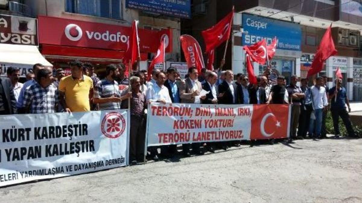 Nezir GÜNEŞ/ MARDİN Mardin'in Vali Ozan Caddesi üzerinde bulunan ve dün kundaklanan Mardin Geçici Köy Korucuları Şehit Aileleri Yardımlaşma ve Dayanışma Derneği önünde toplanan köy korucuları, derneklerinin PKK'lı teröristler tarafından kundaklanmasını protesto etti. Ellerinde Türk bayrakları, üzerinde 'Türk-Kürt kardeştir ayrım yapan kalleştir', 'Terörün dini, imanı, ırkı ve kökeni yoktur, terörü lanetliyoruz' yazılı pankartlar taşıyan korucular adına basın açıklamasını Türkiye Geçici Köy Korucuları ve Şehit Aileleri Federasyonu Başkanı Orhan Kandemir yaptı.