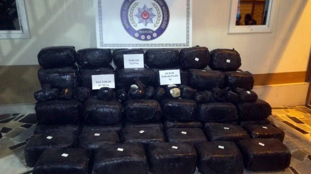 MARDİN (İHA) – Mardin’in Midyat ilçesinde düzenlenen uyuşturucu operasyonunda 722 kilo 150 gram esrar maddesi ele geçirildi.Edinilen bilgiye göre, Mardin Emniyet Müdürlüğü Narkotik Suçlarla Mücadele Şube Müdürlüğü ekiplerince uyuşturucu ve uyarıcı madde ticareti yapan şahıslara yönelik gerçekleştirilen operasyonda Midyat ilçesinde Batman-Midyat karayolu üzerinde durumundan şüphelenilen bir aracı havadan ve karadan takibe aldı. Bir süre sonra durdurulan araçta narkotik köpeğinin de yardımıyla yapılan aramada 65 paket halinde 679 kilo 450 gram esrar maddesi ve 34 paket halinde 42 kilo 700 gram uyuşturucu toz esrar maddesi olmak üzere toplam 722 kilo 150 gram esrar maddesi ele geçirildi. Gözaltına alınan aracın sürücüsü M.A., emniyette yapılan işlemlerinin ardından çıkarıldığı mahkemece tutuklanarak cezaevine gönderildi.