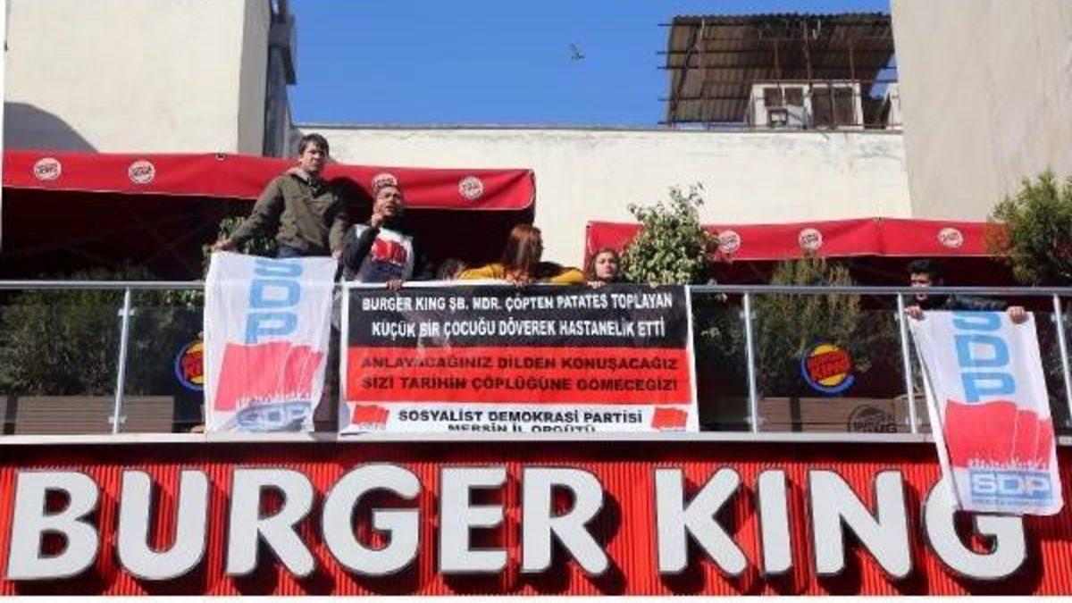 İbrahim MAŞE- Mustafa ERCAN / MERSİN, İstiklal Caddesi'nde hizmet veren Burger King Şubesi'ne gelen 2'si kadın 7 SDP üyesi, işletmenin ikinci katındaki terasını işgal etti. Terasa SDP bayrağı ve 'Burger King Şube Müdürü çöpten patates toplayan küçük bir çocuğu döverek hastanelik etti. Sizi tarihin çöplüğüne gömeceğiz' yazılı pankart asan eylemciler, 'Yaşasın halkın adaleti', 'Hesaplaşma günü korkunç olacak' sloganları attı.