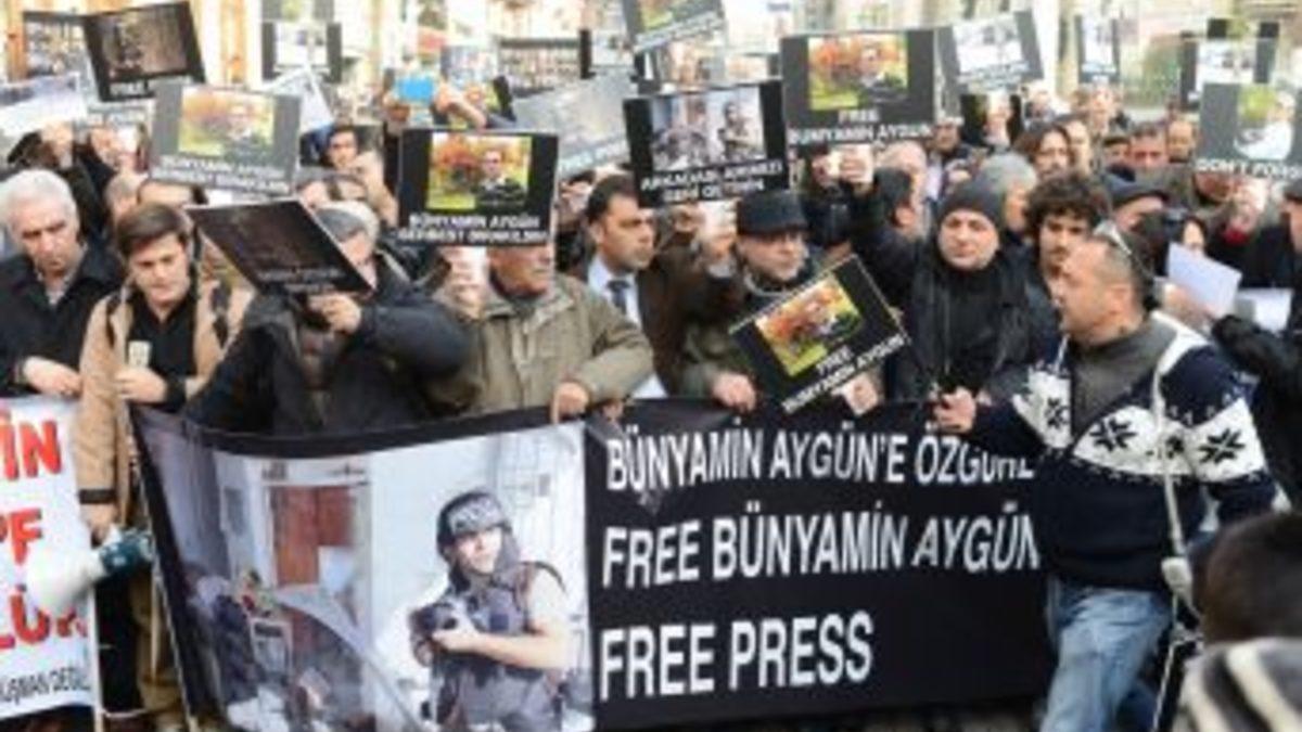 Gazeteciler, Suriye’de kaçırılan ve 39 gündür esir tutulan meslektaşları Milliyet gazetesi foto muhabiri Bünyamin Aygün için yürüdü.Suriye’de 39 gündür esir tutulan gazeteci Bünyamin Aygün için, meslektaşları Galatasaray Meydanı’nda toplandı. Yazar Fikret Bila da meslektaşlarına destek için Galatasaray Meydanı’na gelirken, Bünyamin Aygün’ün ağabeyi Yakup Aygün ve Gümüşhaneli hemşehrileri de eyleme katıldı. Kardeşine kavuşmak istediğini dile getiren ağabey Yakup Aygün, “Bir an önce Bünyamin aramıza katılsın diye buradayız. Gazeteci arkadaşlarla beraber bu eyleme katılıyoruz. Bünyamin sadece görevini yapıyordu.” dedi. Bünyamin Aygün’ün serbest bırakılmasını isteyen gazeteci Fikret Bila, “En son aldığımız bilgi Bünyamin’in sağlık durumunun iyi olduğu şeklinde. Görüşme daha çok resmi kanallardan gerçekleşiyor. Başbakanlık ve Dışişleri Bakanlığı’nın tavsiyeleri bu şekilde. Umarız Bünyamin Aygün, kısa bir süre içinde aramıza döner.” ifadelerini kullandı. Galatasaray Meydanı’nda toplanan gazeteciler daha sonra Tünel Meydanı'na yürümek istedi. Fakat polis son zamanlarda yaşanan olaylar yüzünden yürüyüşün yasak olduğunu söyleyerek, gazetecilerin yürümesine izin vermedi.Bünyamin Aygün için ikinci kez eylem yaptıklarını belirten AFP muhabiri Bülent Kılıç, arkadaşından sağlıklı bir haber beklediklerini söyledi. Gazeteciler adına açıklama yapan Ahmet Şık, “Bünyamin Aygün derhal serbest bırakılsın. Görüşmeler yapılıyor. Süreci baltalamayın dendi. Yüreğimize taş basıp oturduk ama artık yeter” şeklinde konuştu. Bu arada, Gümüşhane Derneği Federasyonu üyeleri bir gazetecinin siyasi slogan attığını iddia ederek, gazetecilerle tartışmaya başladı. Tartışma büyümeden sona erdi. Emniyet görevlileriyle yapılan görüşmelerin ardından polis, gazetecilerin yürüyüşüne izin verdi.