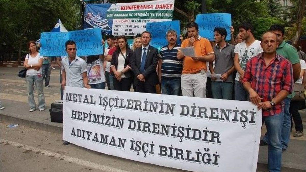Adıyaman İşçi Birliği, metal işçilerine destek için basın açıklaması yaptı.Demokrasi Parkı’nda düzenlenen basın açıklamasına Adıyaman İşçi Birliği üyeleri, siyasi parti temsilcileri, milletvekili adayları ile vatandaşlar katıldı. Basın açıklamasını Adıyaman İşçi Birliği adına okuyan Mehmet Karaman, “Türk Metal Sendikasının yani MESS ile yaptığı ihanet sözleşmesinin mürekkebi kurumadan başta Renault olmak üzere iş yerlerinde ortaya çıkan tepkiler eyleme dönüştü. Metal işçileri MESS ile yapılan ihanet sözleşmesinin yırtılıp atılmasını ve işçilerin talepleri doğrultusunda sözleşme imzalamak istiyorlar. Metal işçilerinin haklı taleplerinin derhal karşılanmasını istiyor, Adıyaman İşçi Birliği olarak direnişteki bütün metal işçilerinin onurlu direnişini selamlıyoruz. Kendi geleceklerini belirleme cesaretini göstererek direnen metal işçileri, iş, ekmek, demokrasi ve onur mücadelesinde yalnız değildir. Ve çıktıkları bu yolda asla yalnız yürümeyeceklerdir. Şimdi iş birlikçi sendika ağalığından hesap sorma ve kendi geleceğimizi ele almak için örgütlenme zamanı. Birleşe birleşe kazanacağız” dedi.Yapılan basın açıklamasından sonra basın açıklamasına katılan katılımcılar olaysız bir şekilde dağıldı.