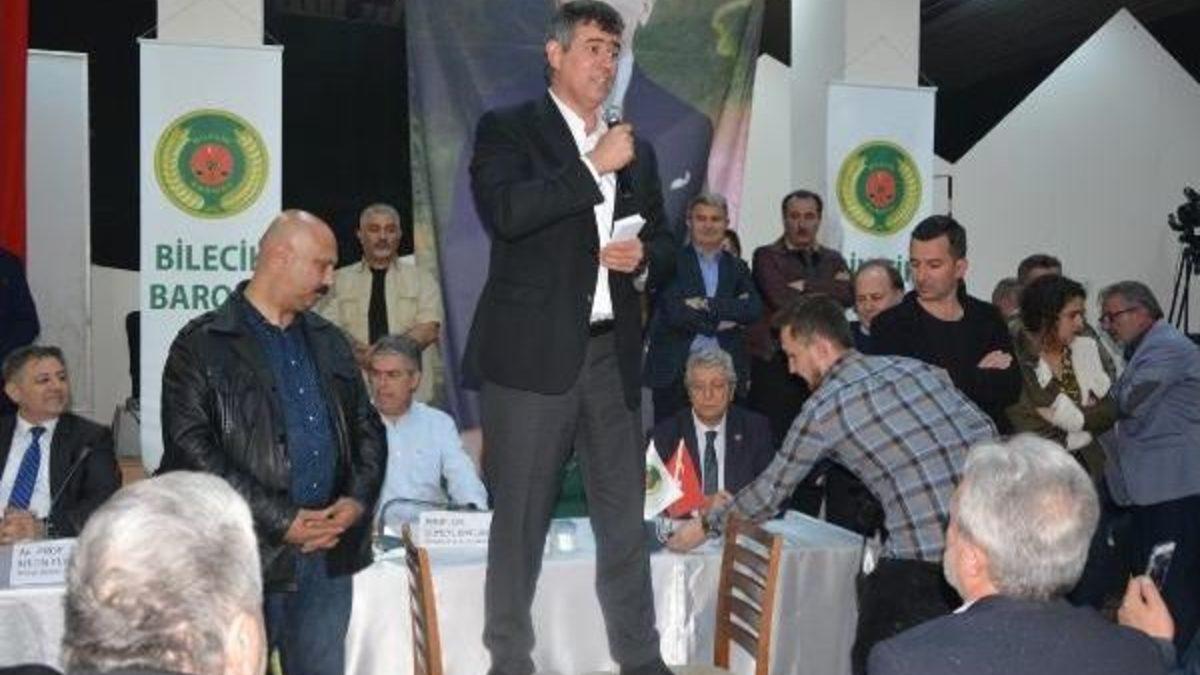 Cafer ELMAS/BİLECİK, Bilecik Barosu tarafından düzenlenen 'Anayasa Değişikliğini Tartışıyoruz' konulu toplantı Belediye Kültür Sitesi'nde düzenlendi. Metin Feyzioğlu, toplantıda, arkalarda oturanların kendisini görmesi için iki sandalyeyi birleştirip üzerine çıkarak konuştu. Türkiye Barolar Birliği ile baroların anayasa deşikliği konusunda vatandaşları bilgilendirmeye çalıştığını söyleyen Feyzioğlu bu konuda zaman zaman ağır eleştirilere maruz kaldıklarını söyledi. Feyzioğlu, "İstifa et, geç bir partinin başına dendiğini duyuyoruz. Milli bir meseleyi, milli bir davayı, Türk milletinin ve Türk devletinin bu dönemde karşılaştığı en zor davayı bir siyasi parti ya da particilikle eş tutanlar, kendi zihinlerini yansıtmaktadırlar. Bu iş partilerarası bir yarışma meselesi değildir ve bu işi bir partinin içinde genel başkanlık amacıyla takip eden kim varsa da alçaktır" dedi.