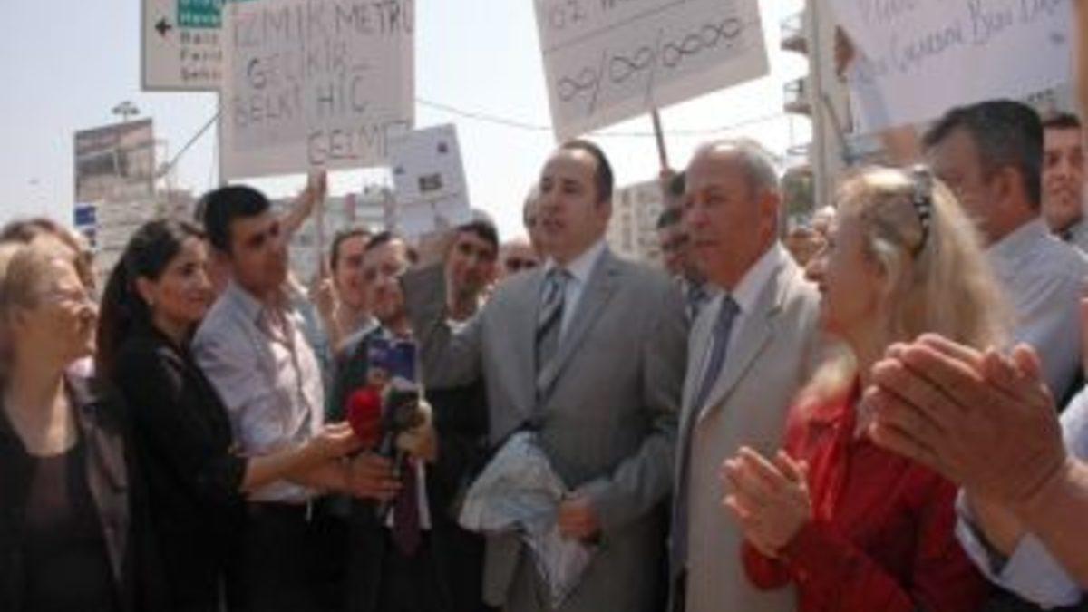Protesto gösterisine AK Parti Konak İlçe Başkanı Yaşar Ötnü, Karabağlar İlçe Başkanı Kadir Uçar ve Balçova İlçe Başkanı Oktay Duru ve çok sayıda partili katıldı. "İzmir metrosu gecikir, belki hiç gelmez", "İzmir'in yolları taştan, sen çıkardın metro beni baştan" ve "Susma, sustukça metro bitmez" yazan dövizler taşıyan partililer, bu sistemle problemin çözüme kavuşmayacağını savundu. 5,5 km.’lik yolun 10 yılı aşkın süredir tamamlanamadığına dikkat çeken Karabağlar İlçe Başkanı Uçar, "Yaklaşık 5,5 kilometrelik hattı bitiremediler. Halk ve esnaf perişan oldu. Ankara ve İstanbul'da nasıl yapıldıysa İzmir'de de bitirilmesini istiyoruz. Ne yapıyor, ne yaptırıyor. Bu da iş bilmezliklerinden kaynaklanıyor." dedi. Balçova İlçe Başkanı Duru ise metro inşaatının çevre esnafını iflasın eşiğine sürüklediğini söyledi. Esnafın, ayakta kalabilmek için kredi çektiğini anlatan Duru, "Bölgede emlak fiyatları yarı yarıya düştü. Halkın şikayetlerini dile getiriyoruz. Yetkilileri göreve çağırıyoruz." dedi. Konak İlçe Başkanı Yaşar Ötnü de, "Metronun bitiş tarihi sürekli erteleniyor. Metronun keşif projesi, zemin etüdü iyi yapılmamış. Jeoloji mühendisliği çok gelişti ancak bu gelişmelerden yararlanamıyorlar. Yazın tozundan, kışın çamurundan bıktık. Konak Belediye Başkanı Hakan Tartan, metro projesinin bitirilmesi için Kocaoğlu'na baskı yapsın." diye konuştu.