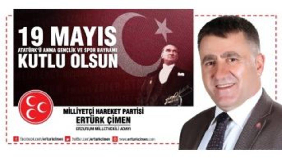 Erzurum MHP Milletvekili Adayı Ertürk Çimen; Mayıs Atatürk’ü Anma, Gençlik ve Spor Bayramının 96. yıl dönümünü dolayısıyla bir kutlama mesajı yayınladı.Ertürk Çimen mesajında şunları kaydetti; "Birlik ve beraberlik içinde bu topraklara ve tarihimize duyduğumuz derin sevgi ve bağlılık, birlikte oluşturacağımız mutlu ve müreffeh geleceğe olan güvenimiz, milletçe bizi birbirimize daha çok kenetleyecektir.Bu duygularla, bu özel günü gençliğimize emanet eden Gazi Mustafa Kemal ve İstiklal Savaşımızın şehit ve gazilerini, isimsiz kahramanlarını rahmet ve minnetle yad ediyor, Gençlik ve Spor Bayramını en içten dileklerimle kutluyorum.”