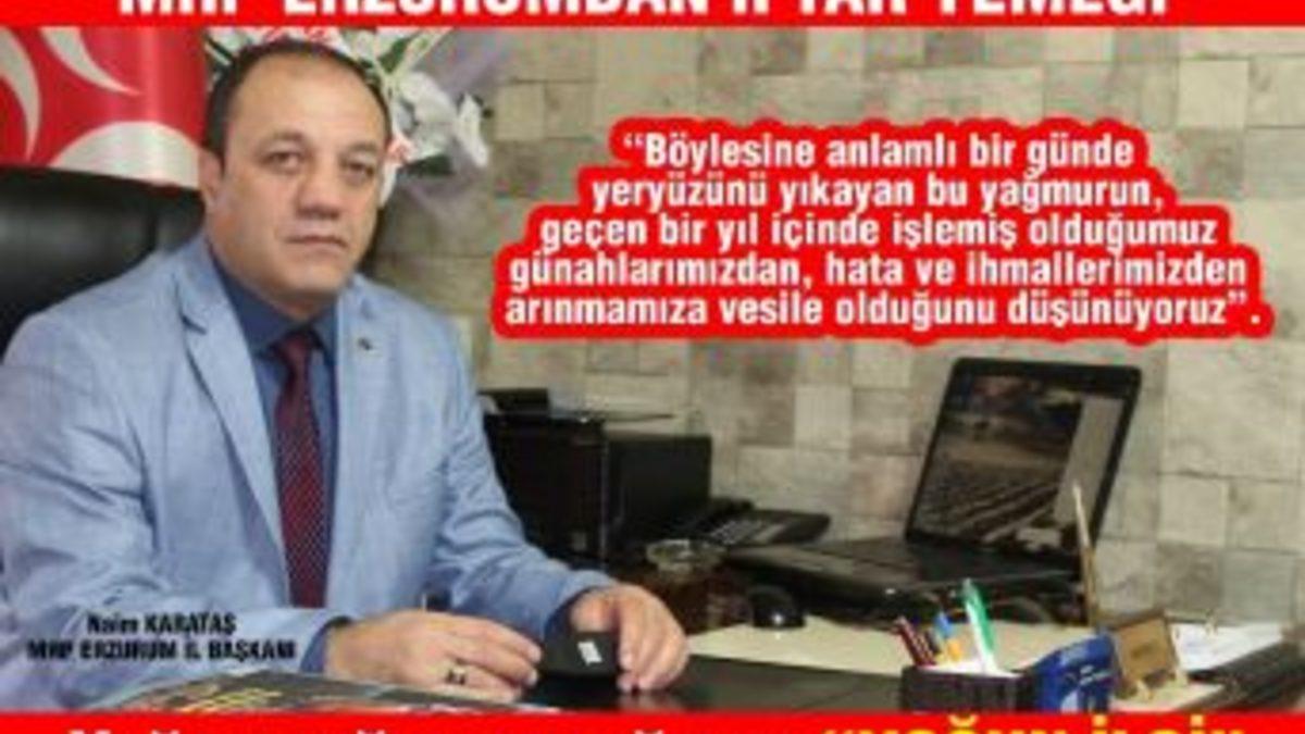 Milliyetçi Hareket Partisi Erzurum İl Başkanlığı tarafından kardeşlik ve dayanışma ruhunun pekiştirilmesini sağlamak amacıyla iftar yemeği düzenlendi.Milliyetçi Hareket Partisi Erzurum İl Başkanı Naim Karataş, partililerle bir arada olmaktan mutlu olduğunu belirterek yaptığı açıklamada şu ifadelere yer verdi:“ Rahmet ve mağrifet dolu bu güzel Ramazan gününde, gönül ve ülkü birliği yaparak, omuz omuza yürüme zamanıdır diyerek dava arkadaşlarımızla bir arada olabilmek adına düzenlediğimiz iftar programımıza adeta rahmet yağdı. Böylesine anlamlı bir günde yeryüzünü yıkayan bu yağmurun, geçen bir yıl içinde işlemiş olduğumuz günahlarımızdan, hata ve ihmallerimizden arınmamıza vesile olduğunu düşünüyoruz. Bizler Türk Milleti olarak, her karış toprağının şehit kanlarıyla sulanmış, gözyaşlarının eksik olmadığı bir coğrafyada yaşıyoruz. Bu tür zorluklarla karşı karşıya kalıyoruz diye bu cennet vatanın tek bir karış toprağından yada tek bir taşından vazgeçecek değiliz. Ülkemiz üzerinde dahili ve harici tezgahlanan oyunlar karşısında durabilmek için, dargınlıkları küskünlükleri bir kenara itip, kenetlenmeli birbirimize sımsıkı sarılmalıyız. Unutmayalım ki; bizim İstiklal Marşımız Korkma! diye başlıyor. Birlik ve beraberliğimizi daim ettiğimiz müddetçe düşman ne kadar sıklıkla hangi oyunlarla gelirse gelsin, damarlarında asil kan taşıyan Büyük Türk Milleti bu oyunların alayını bozacak güçtedir. Türk Milletinin sigortası olan bilge liderimiz Devlet Bahçeli ve büyük turan ülküsünün neferleri, ülkemize ve milletimize yapılacak olan her türlü kalleşliğin karşısında her daim dim dik durmaya hazırdır. Devlet-i ebed-müddet kılmayı şiar edinen biz ülkücüler, bu ülkeyi karşılıksız sevenler olarak devletimiz üzerinde oynanan hiçbir oyunun sonuca ermesine müsaade etmeyeceğiz. Liderimiz Devlet Bahçeli öncülüğünde gerek ülkemiz içerisindeki gerekse partimiz içerisindeki bütün fitne ateşini söndürerek, olması gereken birlik ve bütünlüğü yeniden sağlayacağız. Çünkü biz yeminimizi henüz unutmadık. Mücadelemiz milliyetçi Türkiye ‘ye, Turan ’a kadardır. Mücadelemizde hiç bir engel tanımayacağız. Yılmayacağız, yıkılmayacağız.”Düzenlenen iftar yemeğine yönetim kurulu üyeleri ve birçok partili katıldı.