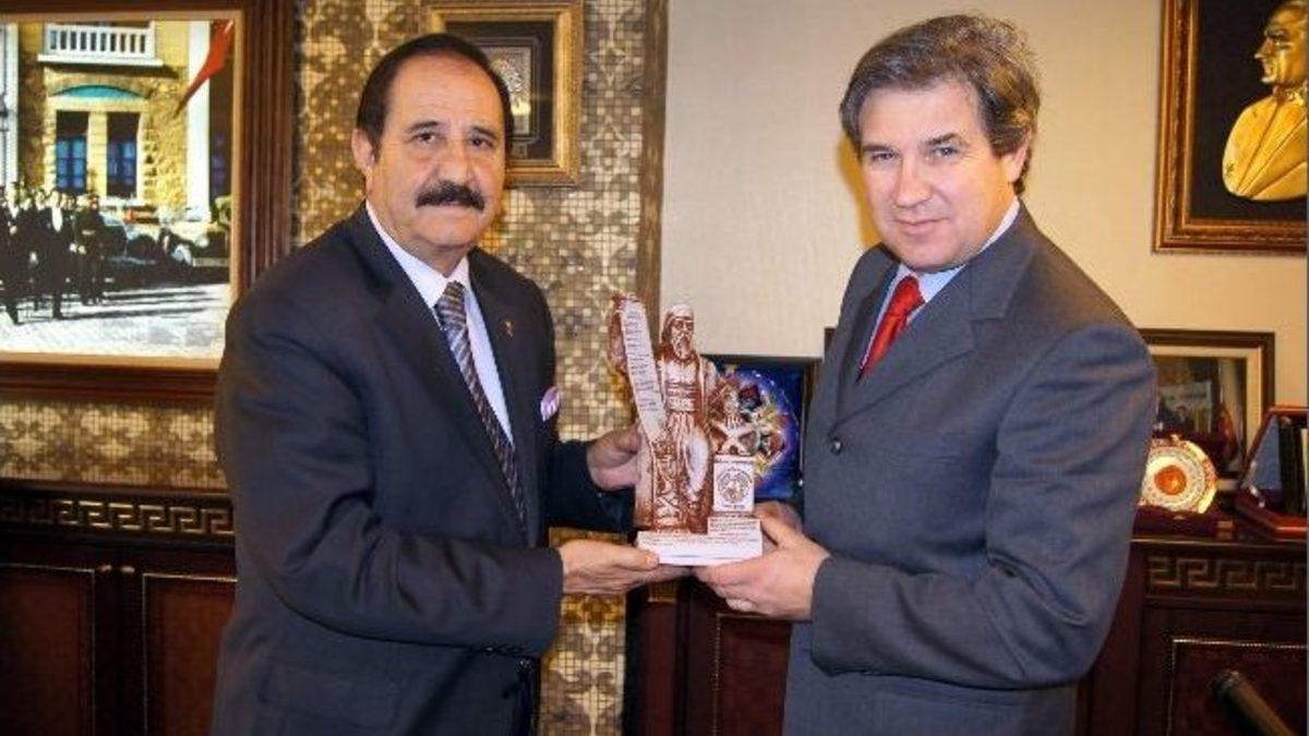 Esnaf ve Sanatkarlar Odaları Birliği Başkanı Beşir Köksal, yabancı uzmanlara ziyaretleri anısına Ahi Evran'ın resminin yer aldığı heykel hediye etti.