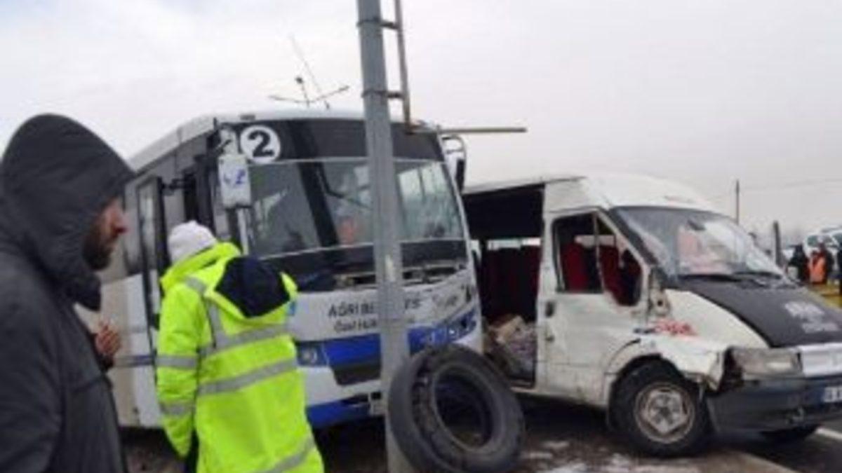 Ağrı’da iki minibüsün çarpışması sonucu 1 kişi hayatını kaybederken, 9 kişi yaralandı.Alınan bilgilere göre kaza, Ağrı-Erzurum karayolu sanayi mevkisinde meydana geldi. Sürücüsünün ismi öğrenilemeyen 04 Z 0022 plakalı yolcu otobüsü ile Murat B. yönetimindeki 04 M 1480 plakalı minibüs çarpıştı. Kazada İpek T. (13) isimli çocuk hayatını kaybederken, Murat B. ile aynı araçta bulunan Halil T., Elmas D., Aykut D., Murat I., Ferdi T., Vedat Ö., Halis D. ve Yenigün D. yaralandı. Yaralılar Ağrı Devlet Hastanesinde tedavi altına alınırken, soruşturmanın sürdürüldüğü belirtildi.
