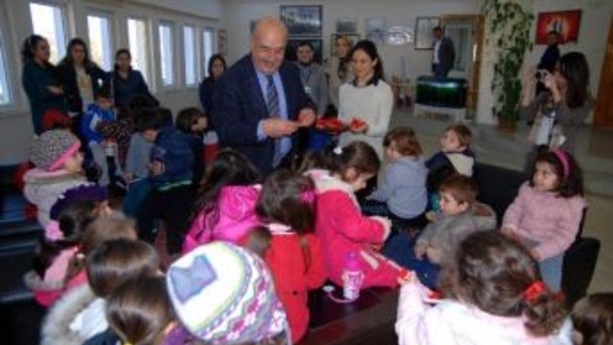 Didim Vilayetler Hizmet Birliği Anaokulu’nun Minik Kalpler ve Kelebekler sınıflarından toplam 30 çocuk Enerji Haftası etkinlikleri kapsamında, Didim Belediye Başkanı Mümin Kamacı’yı ziyaret etti.Didim Vilayetler Hizmet Birliği Anaokulu öğrencileri Öğretmenleri ile birlikte Didim Belediye Başkanı Mümin Kamacı’yı ziyaret etti. Ziyarette minik öğrenciler Başkan Mümin Kamacı’ya kendi yaptıkları resimleri hediye etti. Başkan Kamacı’da miniklere çikolata ikram ederek teşekkür etti.Ardından Başkanla sohbet eden anasınıfı öğrencileri, sordukları sorularla Başkan Kamacı’yı şaşırttılar. Suyun evlere nasıl ve hangi yollarla ulaştığını öğrencilere anlatan Kamacı ayrıca elektrik ve suyun önemine değinerek, neden dikkatli tüketmemiz gerektiğini anlattı.Minikler Başkan Kamacı’ya dönme dolap, şişme oyuncak parkı, oyun potası gibi taleplerde bulundu.