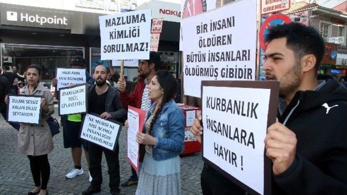 Mısır’da 529 İhvan-I Müslimin taraftarının idam edilmesi kararı Antalya'da da protesto edildi. Sosyal medyada yapılan protesto çağrısına 5 kişi katıldı.Antalya’da kendilerine “Antikapitalis Müslümanlar” adını veren grup, Mısır’da yaşanan olaylar sonrası 529 İhvan-I Müslimin üyesinin hakkında idam kararı verilmesini protesto etti. Kentin araç trafiğine kapalı olan Kazım Özalp Caddesi üzerinde bir araya gelen grup ellerinde “Mazluma kimliği sorulmaz”, Kurbanlık insanlara hayır”, “Ne Mursi, ne Sisi acımız insanlığın katledilmesi” şeklinde pankart taşıyıp “İdama hayır” diye slogan attılar.EYLEME 5 KİŞİ KATILDIEyleme ilişkin açıklama yapan Antikapitalis Müslümanlar Dönem Sözcüsü Sibel Bozkaya Mısır’da yaşanan olayları kınadıklarını söyledi. Yaşanan olayların insanlık dışı olduğunu da belirten Bozkaya, Antikapitalis Müslümanlar olarak insanlık dışı bütün olayların karşısında olduklarını ve haklarında idam kararı verilen insanların serbest bırakılmasını istediklerini belirtti. Grubun sosyal medya ve broşür dağıtılarak yaptığı eylem çağrısına yalnızca 5 kişinin katılması gözlerden kaçmadı.Eyleme neden sadece kişinin katıldığı yönünde sorulan soruya Dönem Sözcüsü Bozkaya, “Güzel bir soru. İnsanların tercihidir. Biz çağrımızı yaptık” şeklinde yanıtladı.Eylem yapan grup, cadde üzerinden geçen vatandaşlar tarafında da cep telefonuyla kaydedildi. Eylem açıklamanın ardından son buldu.