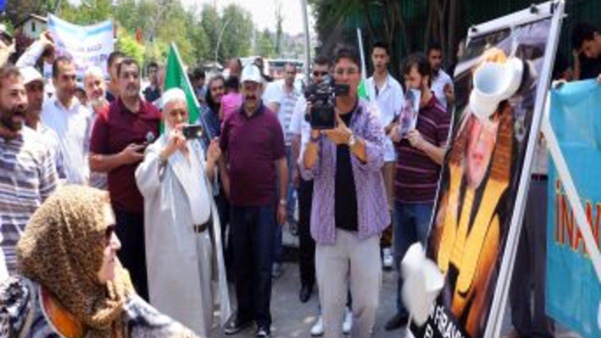 Açıklamanın ardından grup üyeleri Mısır’da yapılan darbeyi hedef tahtasına koydukları Sisi’nin resmine terlik fırlatarak protesto etti. Terlikle Sisi’nin resmine vuran grup daha sonra Sisi’nin resmini ayaklarının altına alıp ezdi. Grup, indirilen resmin yerine Mursi’nin resmini astı.