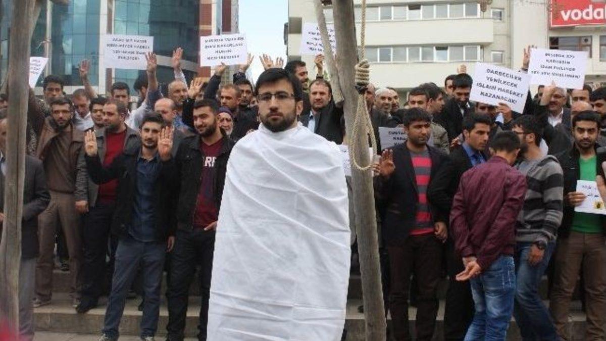 Mısır'da 529 kişiye verilen idam cezası tüm yurtta olduğu gibi Elazığ’da da protesto edildi.Ak Parti Gençlik Kolları tarafından Postane Meydanı’nda düzenlenen protestolara çevrede bulunan vatandaşlar da katıldı. AK Parti İl Teşkilatı ve Belediye Başkanı Mücahit Yanılmaz’ın da katıldığı idam karşıtı protesto gösterisinde kararın yanlış olduğuna vurgu yapıldı. Ak Parti İl Gençlik Kolları Başkanı Hasan Murat Öz yaptığı konuşmada, “Özgürlüğünü, ruhunda beslediği inancına bağlı kılan bizler için, dar ağaçları da cellatlar da korkutucu değildir. Bizler oynanan riyakar oyunlara karşı istikrarlı bir şekilde tepkimizi gösterip, Mısır’da darbeyi ret ve meşruiyete destek için cunta karşıtı gösteri yapan 529 kişiye idam cezası verilmesini kınıyoruz” ifadelerini kullandı.AK Parti İl Başkanı Ejder Açıkkapı da konuşmasında, zulme karşı direnişe devam edeceklerinin altını çizerek, darbeyle gelen askeri yönetimi eleştirdi. Elazığ Belediye Başkanı Mücahit Yanılmaz ise darbe yönetimine Elazığ’dan karşı olduklarını ifade etti ve zulmün ebedi olmadığını kaydetti. Rabia işaretleriyle sloganlar atan kalabalık daha sonra sessizce dağıldı.
