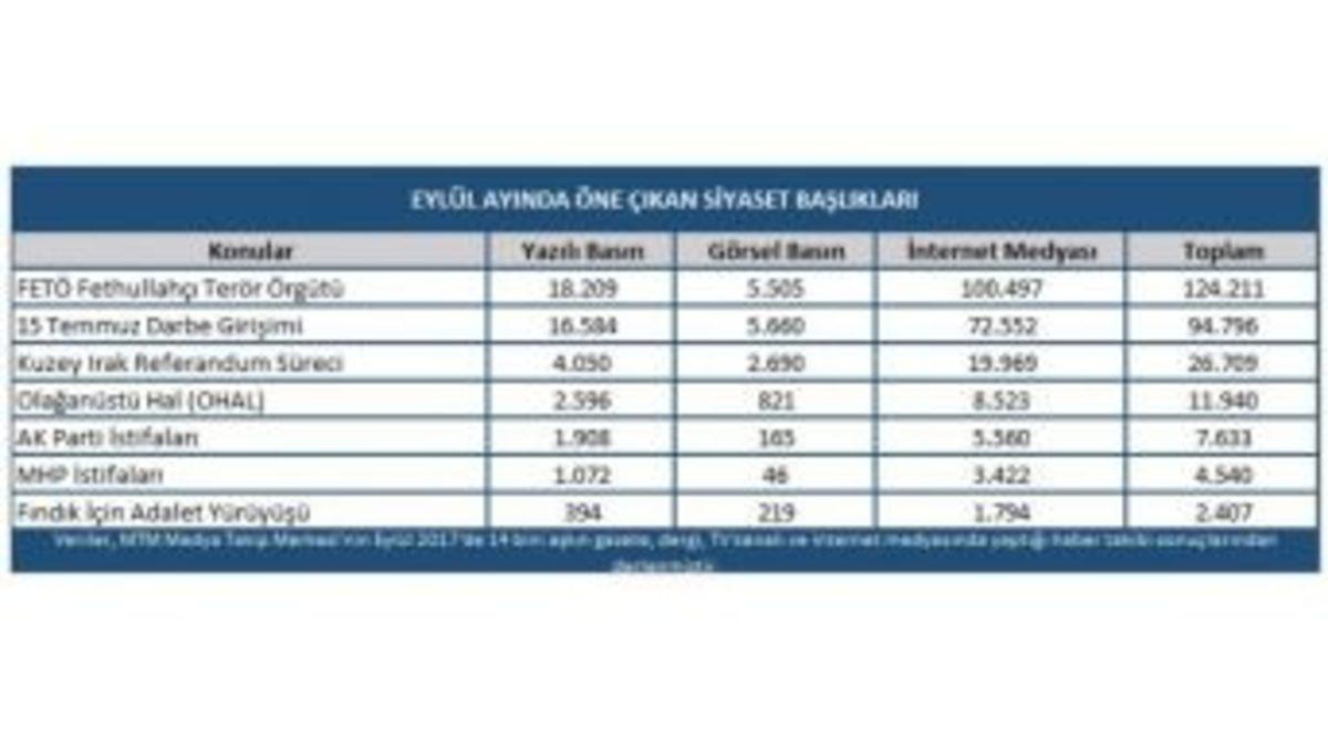 Medya Takip Merkezi (MTM), siyaset dünyasının Eylül ayı gündemini belirleyen konuları açıkladı. 15 Temmuz darbe girişiminin yankıları sürerken, Kuzey Irak’ta yapılan referandum ve partilerde yaşanan istifalar öne çıkan başlıklar oldu.Medya Takip Merkezi (MTM), siyaset dünyasının Eylül ayı gündemini belirleyen konuları açıkladı. Siyasetin Eylül ayı gündeminde Fethullahçı Terör Örgütü FETÖ’nün darbe girişiminin yankıları devam ederken, dikkat çeken diğer başlık ise Kuzey Irak’ta yapılan referandum oldu. FETÖ terör örgütü ay boyunca medyada 124 bin 211 haberin konusu olurken, 15 Temmuz darbe girişimi ise 94 bin 796 haberde yer aldı.Türkiye Kuzey Irak’ta yapılan referanduma karşı çıktıReferandumun yapılıp yapılmayacağına dair haberler yayınlanırken, Türkiye Büyük Millet Meclisi (TBMM) olağanüstü toplanma kararı aldı. Yapılan toplantıda TBMM’de sunulan, Irak ve Suriye’ye asker gönderilmesine olanak sağlayan tezkere AK Parti, MHP ve CHP’nin oylarıyla kabul edildi. Türkiye ve İran’dan gelen tepkilere ve alınan önlemlere rağmen, Irak Kürdistan Bölgesel Yönetimi’nde (IKBY) bağımsızlık referandumu gerçekleştirildi. Buna karşılık Türkiye Kuzey Irak’a çeşitli yaptırımlar uygulayarak referandumu onaylamadığını gösterdi. İlk tepki ise Cumhurbaşkanı Recep Tayyip Erdoğan’dan gelen “Kuzey Irak’a giriş-çıkış kapatılacak, bir gece ansızın gelebiliriz” açıklaması oldu. Tüm bu gelişmelerin ışığında Kuzey Irak referandum süreci toplamda 26 bin 709 habere konu olurken, en çok konuşulan üçüncü başlık oldu.MHP’de Kuzey Irak referandum sürecine karşı tepkisini gösterdiMHP kanadı da Kuzey Irak’ta yapılan referanduma karşı çıktı. Milliyetçi Hareket Partisi Genel Başkanı Devlet Bahçeli, IKBY’inde yapılan referandum ile ilgili yazılı açıklama yaptı. Bahçeli açıklamasında şunları dile getirdi: "Barzani ve peşmergelerinin 25 Eylül 2017’da yaptıkları, hukuki ve siyasi meşruiyeti olmayan ’Korsan referandum’ yok hükmündedir, kağıt üzerinde kalmaya mahkumdur. Ayrıca MHP Lideri Devlet Bahçeli’nin katılımı ile Ankara’da “Kerkük Sevdalıları Buluşuyor” programı gerçekleştirildi. Programda konuşan Bahçeli referandum süreci ile ilgili açıklamalarda bulundu.CHP’nin gündeminde Kuzey Irak referandum süreci ve açıklanan fındık fiyatları vardıBu yıl fındık fiyatlarının 10 lira olarak açıklanması çiftçiyi isyan ettirdi. Beklenenin altında olan fiyat, Cumhuriyet Halk Partisi’nin de ele aldığı konular arasında yerini aldı. Bunun üzerinde Cumhuriyet Halk Partisi, fındık yürüyüşü için harekete geçti. Fındık yürüyüşü CHP Genel Başkanı Kemal Kılıçdaroğlu’nun katılımıyla Ordu ve Giresun illerinde gerçekleşti. MTM’nin aynı raporuna göre, ’fındık için adalet yürüyüşü’ toplamda 2 bin 407 haberin konusu oldu. CHP’nin bir diğer başlığı ise Kuzey Irak’taki referandum süreciydi. CHP Genel Başkanı yaptığı açıklamada, “Süratle Irak Merkezi Yönetimi ile Türkiye ve İran’ın bir araya gelerek soruna ortak çözüm üretmeleri gerekir. Eğer ortak çözüm üretilebilirse Türkiye bu konuda önemli mesafe alabilir” dedi.