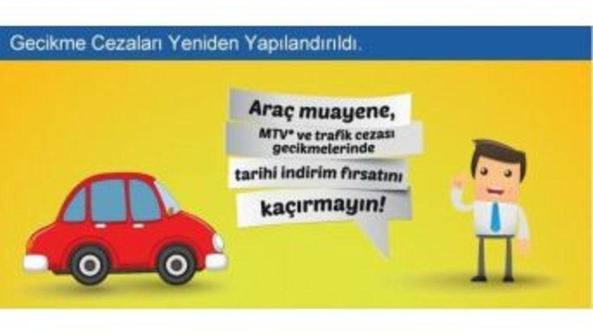 Torba yasayla araç muayene gecikme cezalarına da büyük indirim geldi.Kamuoyunda torba kanun olarak bilinen düzenleme 11 Eylül 2014 tarihli Resmi gazetede yayımlanarak yürürlüğe girdi. Araç muayene gecikme ücretleri 31 Aralık 2014 günü mesai saati bitimine kadar indirimli olarak hesaplanırken, motorlu taşıt vergisi, trafik para cezası, otoyol köprü gecikme zammı ve faizleri de bu yasaya göre yeniden yapılandırılıyor. Bu yapılandırma için ise son başvuru tarihi ise 1 Aralık 2014 olarak açıklandı.Tüvtürk’ten yapılan açıklamada, "Bir aracın muayene edilebilmesi ve ikinci el satışının gerçekleştirilmesi için MTV, trafik cezası ve otoyol geçiş borcu olmamalıdır. Uzun süredir muayenesini yaptıramamış araç sahipleri yıl sonuna kadar sürecek araç muayene, trafik ceza ve motorlu taşıt vergisi gecikme indirimi fırsatını kaçırmamalıdır. Bir yıl gecikmiş bir otomobil 100 lira yerine 18 lira ödeyecek. 4 yıl gecikmiş bir minibüs 400 lira yerine 50 lira, kamyon 535 lira yerine 68 lira, traktör 203 lira yerine 25 lira ödeyecek. 10 yıl gecikmiş bir minibüs 991 lira yerine 120 lira, otobüs/kamyon ise bin 340 lira yerine 169 lira ödeyecek. 10 yıldır muayene yaptırmamış bir traktör 510 lira yerine 62 lira ödeyerek borcundan kurtulacak. Ama bu verilen örnek rakamlar yaklaşık olarak hesaplanmıştır. Her araç için gecikme ayına göre farklılık oluşabilir" dedi.Yetkililer, ayrıntılı bilgi için www.gib.gov.tr sitesini 444 0 189 numaralı hattın aranmasını istedi.