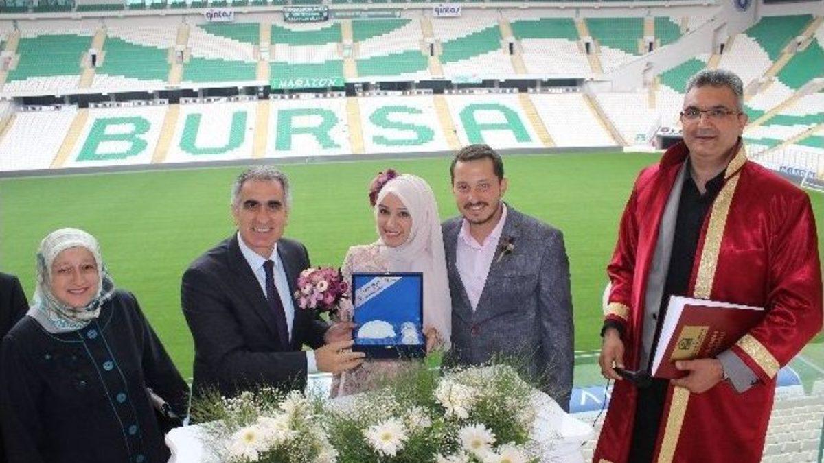 Bursa Büyükşehir Belediyesi Stadı bu defa nikaha sahne oldu.AK Parti Nilüfer İlçe Başkanı Celil Çolak, eski stajyeri ve Büyükşehir Belediyespor Stadı mühendislerinden İbrahim Serhat Ayaz ve Şeymanur Atagün çiftinin nikâh şahidi oldu. Stadın protokol tribününde gerçekleştirilen nikâh merasiminde Ayaz ve Atagün çifti mutluluğa bir ömür boyu ‘evet’ dedi. Genç çiftin nikâhmerasimine çiftin yakınları ve stat görevlileri hazır bulundu.Genç çiftin mutluklarına şahit olmaktan dolayı mutluluk duyduğunu belirten Çolak, “İbrahim Serhat Atagün hem stajyerim, hem de bu stadın Bursa’da yükselmesinde emek harcayan bir mühendistir. Mekan olarak Bursaspor için zaferler kazanmak adına hazırlanmış Büyükşehir Belediyespor Stadı’nı seçmeleri çok manidar oldu. Biz kendilerinden ülkemiz adına nice zaferler kazanacak evlatlar bekliyor ve mutluluklar diliyorum” dedi.