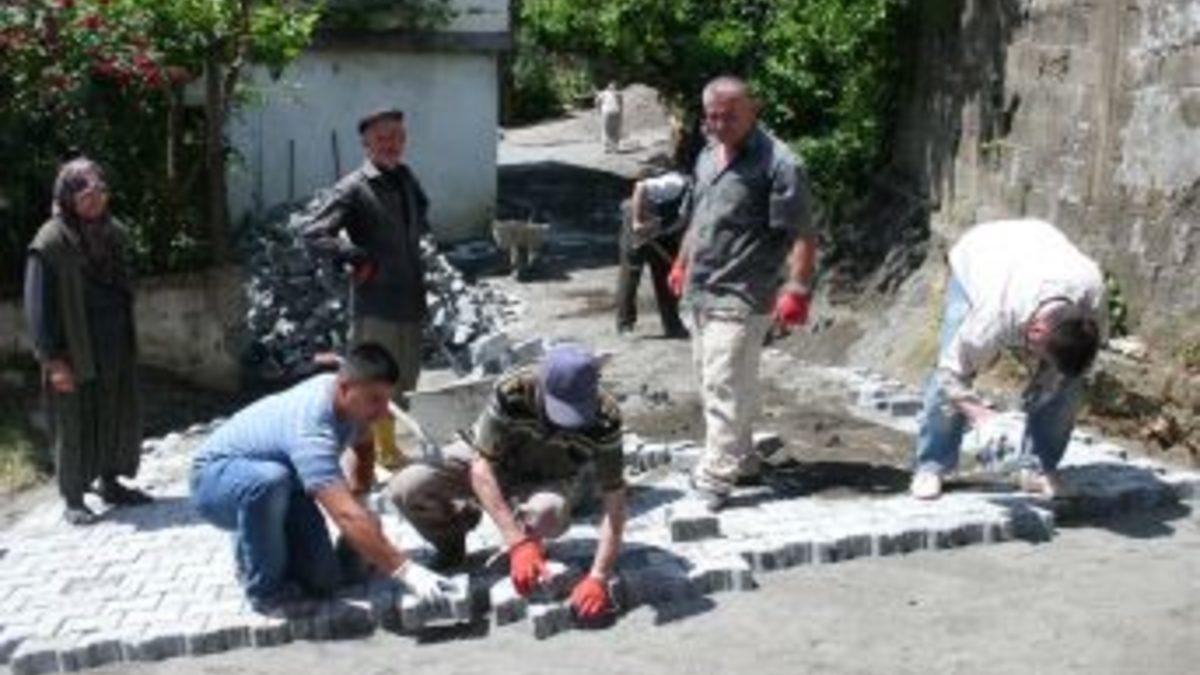 Büyüktekke köyüne verilen taşları köy muhtarı kendisi döşüyor.