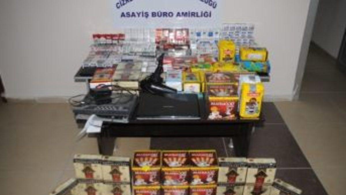 Mardin’in Nusaybin ve Midyat ilçeleri ile Şırnak’ın Cizre ilçesinde bulunan birçok iş yerini soyan 7 kişi, Cizre’de çaldıkları eşyalarla birlikte yakalandı.Şırnak’ın Cizre ilçesinde Asayiş Büro Amirliği'ne bağlı sivil ekipleri, sabaha karşı saat 04.00 sularında Şah Mahallesi Hökenek Caddesi ile Özalp Sokağı kesişiminde bulunan Sarıyıldız İş Merkezi'nin içerisindeki bakkal dükkanından yüzleri maskeli 7 kişinin içeriden çıktığını gördü. Polis ekiplerinin kovalaması sonucu R.E. (19), U.Ş. (22), M.D. (20), M.E. (20), F.A. (20), M.A. (21), İ.A. (22) isimli şahıslar çaldıkları eşyalarla birlikte yakalandı. Polisin hırsızların kullandığı otomobil içerisinde yaptığı aramada, şahısların Cizre’ye gelmeden önce Mardin’in Nusaybin ve Midyat ilçelerinde çalmış oldukları, 394 paket değişik marka sigara, 28 paket çay, 15 kutu kahve, 68 adet çikolata, 1 adet dizüstü bilgisayar, 1 adet saç kurutma makinesi, 1 adet kamera kayıt cihazı, 150 lira madeni para ile hırsızlık için kullandıkları levye ve tornavida bulundu. Polis ekipleri tarafından çaldıkları eşyalarla birlikte yakalanan 7 şahsın birçok hırsızlık olayından emniyette dosyaları olduğu tespit edildi. Zanlıların adliyedeki işlemleri devam ediyor.