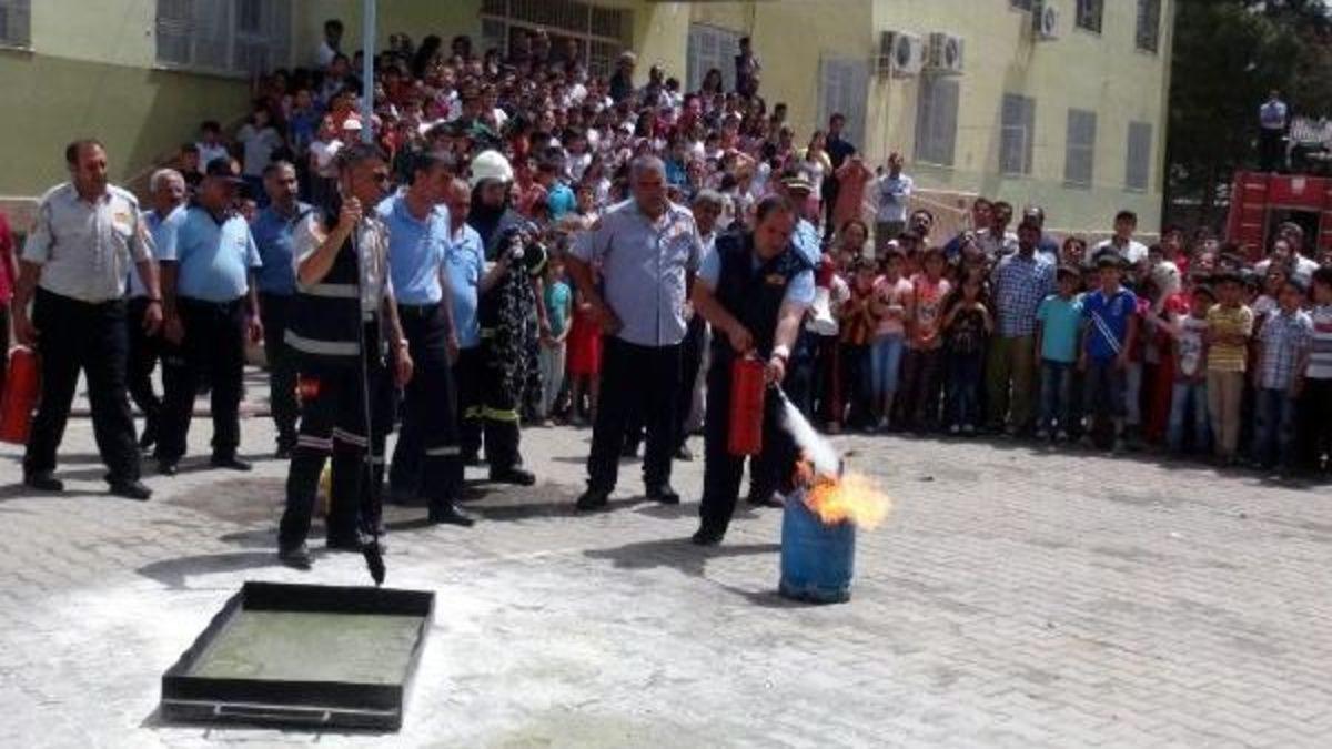 Ahmet AKKUŞ/NUSAYBİN Mardin Büyükşehir Belediyesi'ne bağlı İtfaiye Daire Başkanlığı Eğitim Şube Müdürü Servet Yalçın ile birlikte Nusaybin itfaiye ekipleri, Yıldırım ve Atatürk ilkokullarının bahçesinde, yangın tatbikatı yaptı. Öğrencilere yangın durumunda itfaiyeye ulaşmak için 110 numaralı hattnıı ücretsiz arayabileceği bilgisini veren Eğitim Şube Müdürü Servet Yalçın, çocuklara bir evde yanan mutfak tüpünü ve yangın söndürme aletiyle o tüpü ve yangını nasıl söndürüleceğini uygulamalı anlattı. İtfaiye erleri, öğrencilerin önünde mutfak tüpünü ateşe verdi. Çocukların korktuğunu gören Yalçın, "Bu şekilde tüp kısa süreli yanıyorsa hemen üzerine ıslak bir battaniye veya bir bez örterek tüpün vanasını kapatın, o söner. Eğer uzun süreli yanıyorsa hemen oradan kaçın ve 110 yangın ihbar hattını arayın" dedi.