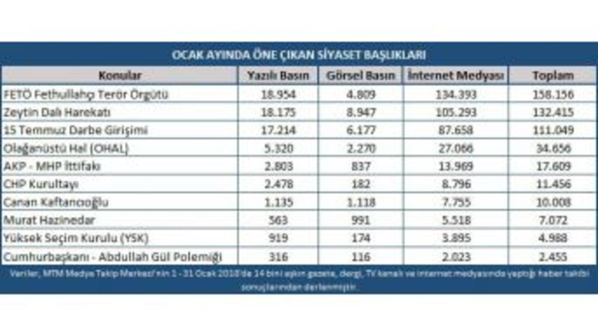Medya Takip Merkezi (MTM), ay boyunca Türk siyasetinin medyadaki nabzını tuttu, Türkiye’nin gündeminde olan konuların medyaya yansıma rakamlarını açıkladı.MTM, ay boyunca Türk siyasetinin medyadaki nabzını tuttu, Türkiye’nin gündeminde olan konuların medyaya yansıma rakamlarını açıkladı. Türkiye yılın ilk ayını geride bırakırken, dış ilişkilerde olduğu kadar iç ilişkilerde de hareketli günler yaşandı. Türk Silahlı Kuvvetleri, Suriye’nin kuzeybatısında bulunan Afrin’e yönelik Zeytin Dalı Harekatı’nın başladığını açıkladı. OHAL tekrar uzatılırken, Kemal Kılıçdaroğlu yeniden Cumhuriyet Halk Partisi (CHP) Genel Başkanlığı’na seçildi.Türk Silahlı Kuvvetleri, Suriye’nin kuzeybatısında bulunan Afrin’e yönelik Zeytin Dalı Harekatı’nın başladığını açıkladı. Açıklamada harekatın sınırlarımızda ve bölgede güvenlik ve istikrarı sağlamak amacıyla başlatıldığı ve harekatının adının ’Zeytin Dalı’ olduğu belirtildi. Devam eden operasyonun etkileri sürerken, medyada yer alan başlıklar incelendi. Medyada konu ile ilgili öne çıkan başlıklar; Türkiye’nin dört bir yanından operasyona verilen destekler, operasyonda etkisiz hale getirilen terörist sayısı ve operasyonun ekonomi üzerindeki etkileri olarak belirlendi. Zeytin Dalı Harekatı, ay boyunca 132 bin 415 habere konu olarak siyasette en çok konuşulan konu başlıklarından biri oldu.OHAL uzatıldı15 Temmuz darbe girişiminin ardından Olağanüstü Hal (OHAL) ilk olarak 21 Temmuz 2016’da ilan edilmişti. TBMM Genel Kurulu’nda OHAL’in uzatılmasına ilişkin Başbakanlık tezkeresinin görüşmeleri yapıldı. OHAL Tezkeresi’nin uzatılmasına dair AK Parti ve MHP’den ’’evet’’ oyu geldi. Böylece OHAL’in 3 ay daha uzatılmasına karar verilerek ilan edildiği günden bu yana 6’ncı kez uzatılmış oldu. OHAL ay boyunca 34 bin 656 habere konu edildi.MHP 2019 seçimlerinde aday göstermeyecekMilliyetçi Hareket Partisi (MHP) Genel Başkanı Devlet Bahçeli, medya kuruluşlarının Ankara temsilcileri ile sohbet toplantısında MHP’nin 2019 Cumhurbaşkanlığı seçimlerinde aday göstermeyeceğini söyledi. Bahçeli, MHP’nin Cumhurbaşkanlığı seçimlerinde Yenikapı ruhuyla hareket ederek, Recep Tayyip Erdoğan’ı destekleme kararı alacağını belitti. CHP kanadından ise bu durumun beklenen ’doğal kenetlenme’ olduğu yönünde açıklama gelirken, CHP olarak 2019 seçimlerine hazırlandıkları da belirtildi. MTM’nin hazırladığı rapora göre AK Parti MHP ittifakı 17 bin 609 haberde yer aldı.Kemal Kılıçdaroğlu yeniden genel başkan seçildiGeçtiğimiz günlerde Cumhuriyet Halk Partisi’nin ’Adalet ve Cesaret’ temalı 36’ncı Olağan Kurultayı gerçekleştirildi. Kurultayda Kılıçdaroğlu aldığı 790 oy ile 5’inci kez genel başkan seçildi. Başkanlığa aday diğer isim olan Muharrem İnce ise 447 oy aldı. ’Mükerrer oy’ tartışmasının yaşandığı kurultay, 11 bin 456 haberin konusu olarak en çok konuşulan başlıklardan oldu.Canan Kaftancıoğlu İstanbul İl Başkanı olduBir hayli hareketli geçen CHP 36’ncı Olağan İstanbul İl Kongresi’nde, İstanbul İl Başkanlığına Cemal Canpolat ile Canan Kaftancıoğlu aday oldu. Yapılan oylama sonucunda Kaftancıoğlu, 325 oyla CHP İstanbul İl Başkanı oldu. Göreve geldiği günden bu yana medyanın gündeminde olan Kaftancıoğlu, Cumhurbaşkanı Erdoğan’dan annesi hakkında attığı tweet nedeniyle özür dilemesiyle de dikkat çekmişti.Murat Hazinedar görevden uzaklaştırıldıMurat Hazinedar’ın hakkında yürütülen soruşturmalar nedeni ile İçişleri Bakanlığı tarafından görevden uzaklaştırıldığı duyuruldu. Ayrıca Hazinedar ile birlikte belediye meclis üyeleri Hüseyin Avni Sipahi ve Çetin Kırışgil de görevden uzaklaştırıldığı belirtildi. Hazinedar, görevden uzaklaştırılması ile hakkında yürütülen soruşturmalarla birlikte toplamda 7 bin 72 haberin konusu oldu.