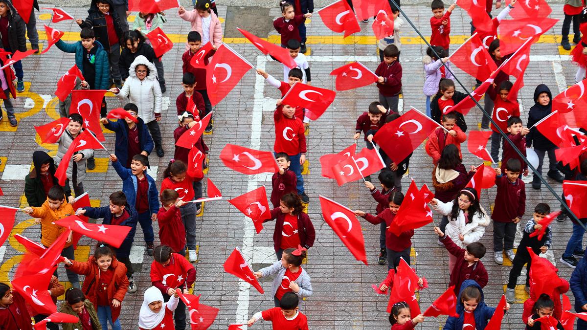 Okul bahçesinde toplanan öğrenciler bayraklarını dalgalandırırken tezahüratlar aralıksız sürdü. Kırmızı balonlar ve Türk bayraklarıyla renklenen bahçede öğrenciler, öğretmenleri ile birlikte marşlar da söyledi.