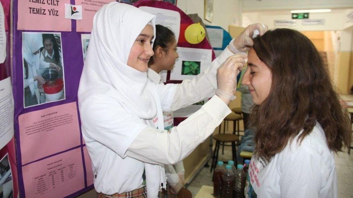 Elazığ’da ergenlik çağında çıkan sivilcelere çözüm arayan iki ortaokul öğrencisi, otlardan doğal yüz temizleyicisi yaptı.Gazi Kamil Ayhan Ortaokulunda okuyan 7. sınıf öğrencileri Ceyla Yazar ve Şeyma Aydınlı, ergenlik döneminde çıkan sivilcelere çözüm aramaya başladı. ‘Temiz Yüz, Temiz Cilt’ ismini verdikleri proje kapmasında araştırma yapan iki öğrenci, antiseptik özelliği olan gül, kekik, mersin, lavanta ve ısırgan otları üzerine çalışma yaptı. Otları teker teker kaynatan öğrenciler, daha sonra mikrop öldürücülüğünü artırmak için içlerine etil alkol koyarak sivilcelere ve siyah noktalara iyi gelen doğal bir losyon üretmeyi başardı. Türkiye Bilimsel ve Teknolojik Araştırma Kurumu (TÜBİTAK) tarafından desteklenen öğrenciler, yaptıkları doğal losyonu da fuarda sergiledi.Ortaokul süreciyle ergenlik dönemine girildiğini ve oluşan sivilce sorunlarına bir çözüm aradıklarını belirten öğrencilerden Ceyla Yazar, “Bunun için antiseptik özelliği olan 5 farklı bitki türü ile etil alkolü karıştırdık. Cildi en iyi temizleyen toniği bulmaya hedefledik. Antiseptik özelliği olan gül, kekik, mersin, lavanta ve ısırgan otunu ilk önce kaynattık. Daha sonra ise mikrop öldürücülüğünü artırmak için içlerine etil alkol koyduk” dedi.Elden ettikleri losyon ile sivilce etkilerinin azaldığını ifade eden Yazar, “Etil alkol mikropların öldürücülüğü artırmıştır. Yüzleri temizlemeye doğal bir çözüm arıyoruz. Hem kirli yüzeylerde hem de kendi yüzümüzde denedik ve faydasını gördük. Zararı olmadığı için arkadaşlarımıza da denemeyi düşünüyoruz. Her bir losyonun faydası var. Bazıları siyah noktaları giderirken bazıları da yüzü temizliyor ve parlatıyor" diye konuştu.
