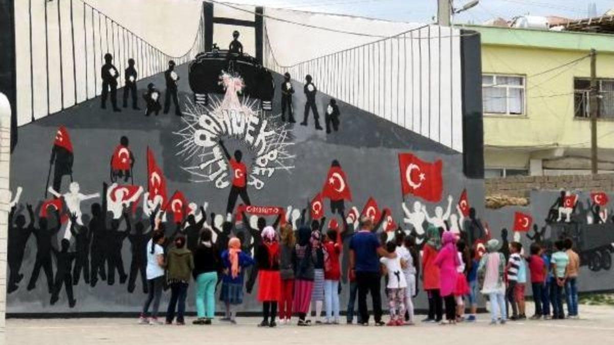 Yeni Mahalle'de 400 öğrencinin eğitim öğretim gördüğü Necip Fazıl Kısakürek İmam Hatip Ortaokulu'nun öğretmenleri, öğrencileriyle birlikte okul bahçe duvarını, 15 Temmuz darbe girişimi ve halkın sergilediği dik duruşu okulun duvarına resmetti.