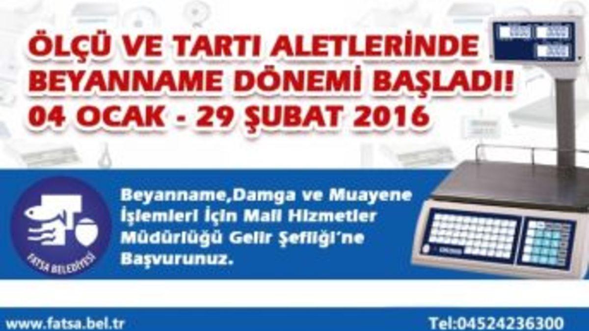 Ordu’nun Fatsa ilçesinde belediye, ölçü ve tartı aletlerinde beyanname dönemi ile ilgili esnafları bilgilendirdi.Fatsa Belediyesi tarafından yapılan açıklamada, “Ölçü ve tartı aletlerinin periyodik muayene süresi iki yıldır. Damga süresini doldurmuş tartı aletlerinin periyodik muayeneleri için, kullanıcılar tarafından sürenin dolduğu yılı takip eden yılın ocak ayının başından Şubat ayının sonuna kadar periyodik muayene için dilekçe verilmesi gerekir. Şubat ayının son günü tatile rastladığı takdirde müracaat sonraki ilk iş gününün mesai bitimine kadar yapılabilir. Tartı aleti kullanıcıları tarafından periyodik muayene için tartı aletinin tipi, markası, seri numarası, sınıfı ve kapasitesinin yer aldığı dilekçeyle grup merkezi belediye ölçüler ve ayar memurluklarına müracaat edilir. Muayene için müracaatta bulunanlara, müracaat edildiğini gösteren bir belge alınması gerekir. Grup merkezi belediye ölçüler ve ayar memurlukları muayeneler için bir program düzenler ve muayeneleri yıl sonuna kadar gerçekleştirirler. Fatsa ilçesinde ticari faaliyette bulunan işletmeler, damga süresi dolmuş olan ölçü ve tartı aletlerinin muayeneleri için beyannamelerini belediyemiz mali hizmetler müdürlüğü, gelir şefliği ölçü ve ayar memurluğuna 29 Şubat 2016 tarihleri arasında müracaat ederek verebilirler” denildi.