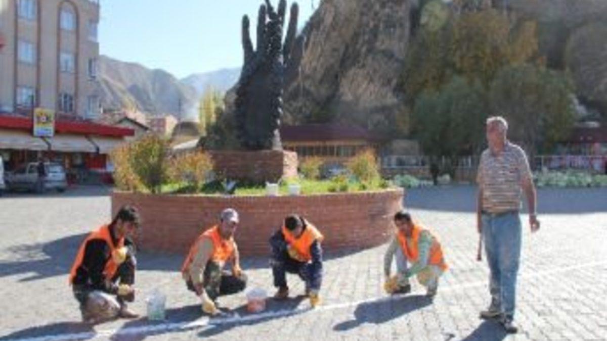 Belediye ve Türkiye İş Kurumu’ndan geçici olarak işe alınan işçiler şehir merkezindeki kaldırım bordürlerini ve Pazar yerini boyamaya devam ediyorlar.