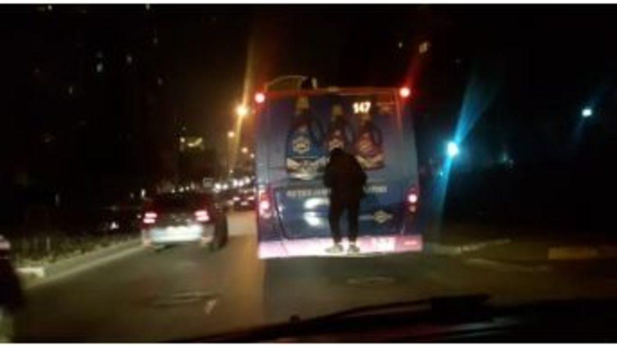 Bahçeşehir’de bir kişinin otobüsün arka tamponuna çıkarak yaptığı ölümüne yolculuk kameralara saniye saniye yansırken, bu durumu gören vatandaşların yüreği ağzına geldi.Bahçeşehir’de kameralara takılan bir görüntü vatandaşları korkuttu. Bahçeşehir Süzer Bulvarı üzerinde seyir halinde giden otobüsün arka tamponuna çıkarak yolculuk yapan şahsı görenler şaşakaldı. Hızla hareket eden otobüsün arka tamponunda bedava yolculuk yapan vatandaş canını hiçe saydı. Otobüsün durağa gelerek durmasının ardından , şahıs da otobüsten inerek, bir süre dinlendi. Otobüsün hareket etmesiyle canı pahasına yaptığı bedava yolculuğa devam etmek isteyen şahıs, yetişemeyince yoluna yaya olarak devam etti. Tüm bu yaşananlar ise kameralara saniye saniye yansıdı. Görüntülerde hareket eden otobüsün tamponunda bir kişi görülüyor. Tamponda yolculuk bir süre devam ederken, şahıs otobüsün durmasıyla aşağıya iniyor. Otobüs tekrar hareket edince şahıs tekrar tampona çıkmaya çalışıyor ama başarılı olamıyor.