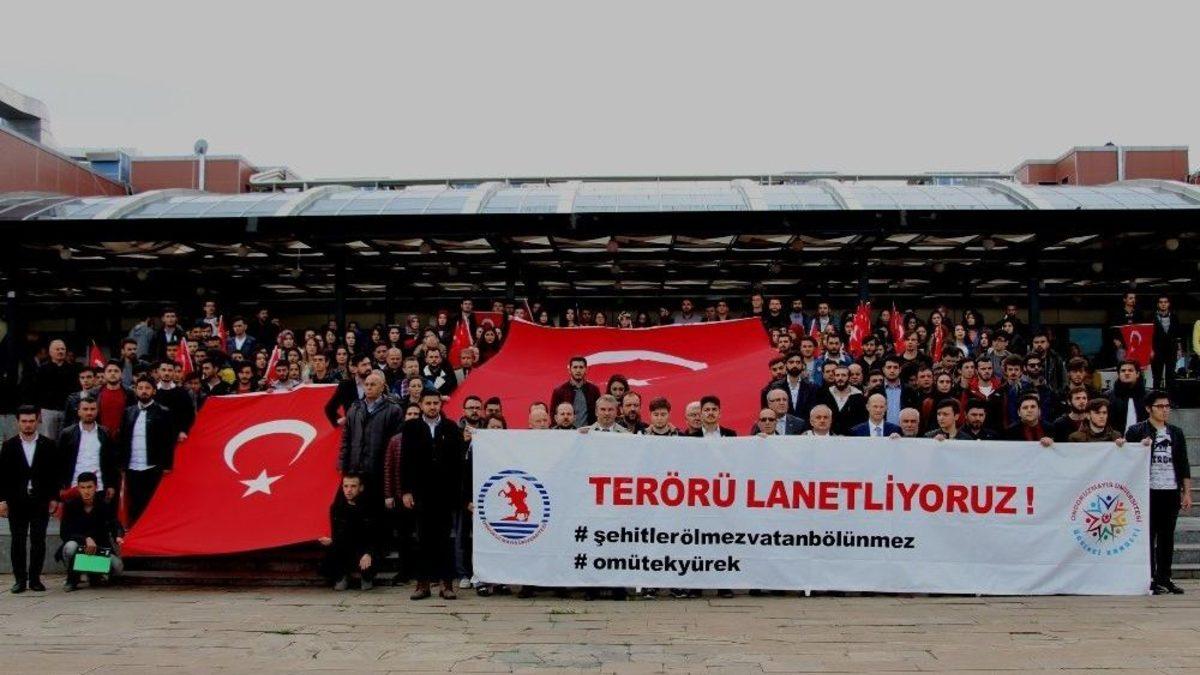 Ondokuz Mayıs Üniversitesi (OMÜ) Öğrenci Konseyi teröre lanet eylemi düzenledi.OMÜ Yaşam Merkezi önünde düzenlenen eylemde son dönemlerde Türkiye’de yaşanan terör eylemlerine tepki gösterilerek birlik ve beraberlik mesajı verildi. Eylem saygı duruşu ve İstiklal Marşı’nın okunmasıyla başladı. Yaşam Merkezi önünde toplanan öğrenciler ellerinde Türk bayrakları ve pankartlarla terörü lanetledi. Eylemde teröre lanet ve "Şehitler ölmez, vatan bölünmez" sloganları atıldı.Eylemde basın açıklaması yapan OMÜ Öğrenci Konseyi Başkanı Muhsin Oğul, "Asırlar boyu devam eden kardeşlik bağlarımızı sarsmak isteyen dış ve iç mihraklardan destek alan dönem dönem ülkemizin başına bela olan terör örgütleri maalesef hainliklerini yapmakta ve yüreklerimizi dağlamaktadır. Son yaşanan olaylar gösteriyor ki ülkemizin geleceği ile alakalı derin hesapları olan her türlü düşmanlarımız ve işbirlikçileri kalleş terör örgütü PKK’yı kullanarak memleketimizin istikrarını bozmaya çalışmaktadır. Ey o düşmanlar ve yandaşları biliniz ki aziz Türk milleti tarihi boyunca zalime boyun eğmemiş, diz çökmemiş ve zulme göz yummamıştır. Ey şanlı bayrağımız seni ilelebet hür kılmak için helal kanları bu topraklarla yoğrulan aziz şehitlerimizi rahmetle anıyor, teröre lanet diyoruz" dedi.Teröre lanet eylemine OMÜ Rektör Yardımcıları Prof. Dr. Mehmet Kuran ve Prof. Dr. Vedat Ceyhan, OMÜ Genel Sekreteri Doç. Dr. Menderes Kabadayı, Ziraat Fakültesi Dekanı Prof. Dr. Yusuf Demir, öğretim üyeleri ve öğrenciler katıldı.