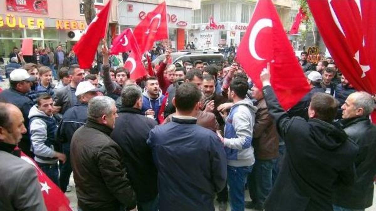 İstiklal Marşı okuyan ve tekbir getirip sloganlar atan grup, HDP'nin tabelasını indirilmesini istediler. Polis, protestocuları sokağa sokmadı. HDP lokalinin bulunduğu sokağın girişine Türk bayrağı asan grup, polis engelini aşamayınca sloganlar atarak uzaklaştı.