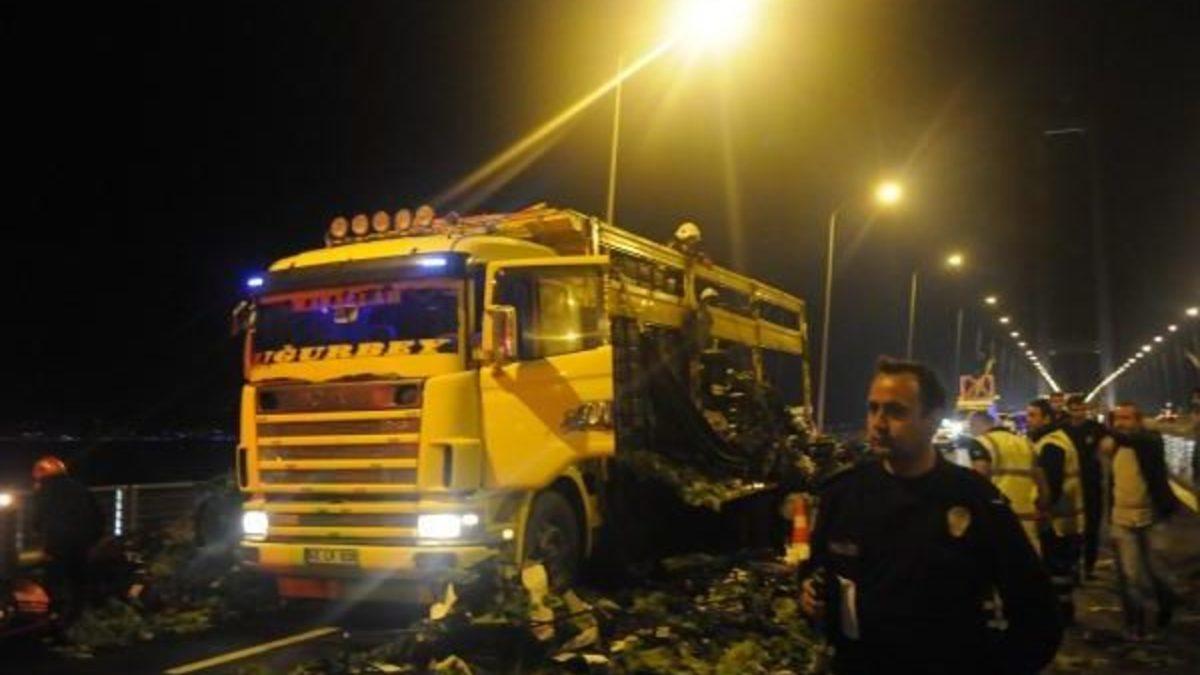 Olay gece yarısı Osmangazi Köprüsü'nün üzerinde meydana geldi. Manisa'dan yüklediği üzüm yaprağını İstanbul'da hale götüren Adem Çelik idaresindeki 45 LV 838 plakalı kamyonun kasasında yangın çıktı. Adem Çelik aracı sağ şeritte durdurarak itfaiyeye haber verdi. Olay yerine gelen itfaiye ekipleri yangına müdahale etti. Kamyonun kasasında bulunan üzüm yaprağı dolu kasalar aşağı indirildi. Alevler aracı sarmadan yangın kontrol altına alınarak söndürüldü. Yangına müdahale edildiği sırada İstanbul istikameti ulaşıma kapatıldı. Söndürme çalışmalarının tamamlanmasının ardından yol ulaşıma açıldı. Yangının balataların tutuşması sonucu çıktığı tahmin edilirken, soruşturma başlatıldı.