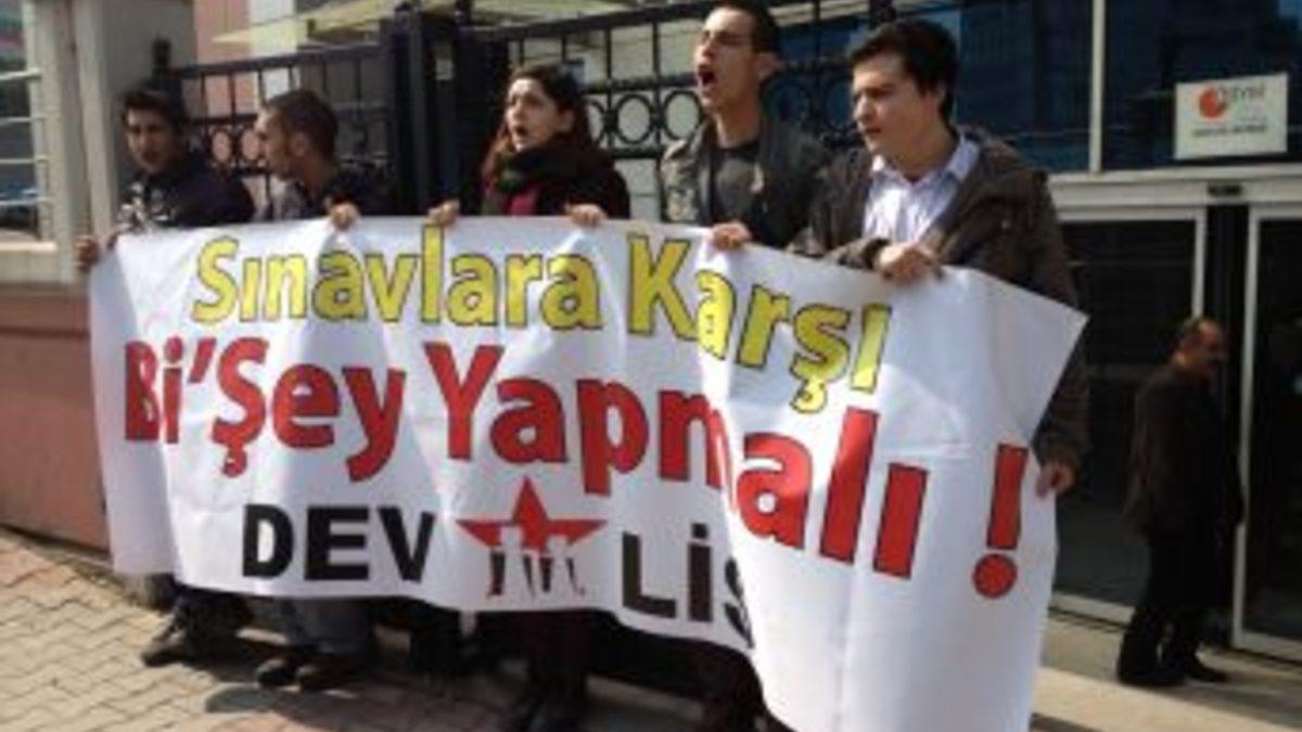 ‘Sınavlara karşı bişey yapmalı’ yazılı pankart açan Dev-Lis üyesi biri kadın 5 kişi kendilerini Kağıthane 4. Levent’teki ÖSYM binasının dışında bulunan demir kapıya zincirledi. ‘Sınavlar kalksın yaşama zaman kalsın’, ‘Sınavlara inat, yaşasın hayat’ sloganları atan gençler, sınav sistemini protesto etmek için bu eylemi gerçekleştirdiklerini söyledi.