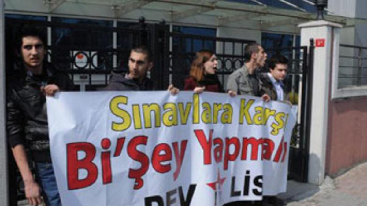 Öğrenciler üzerinde, “Sınavlara karşı bi’şey yapmalı” yazılı pankart açtı.