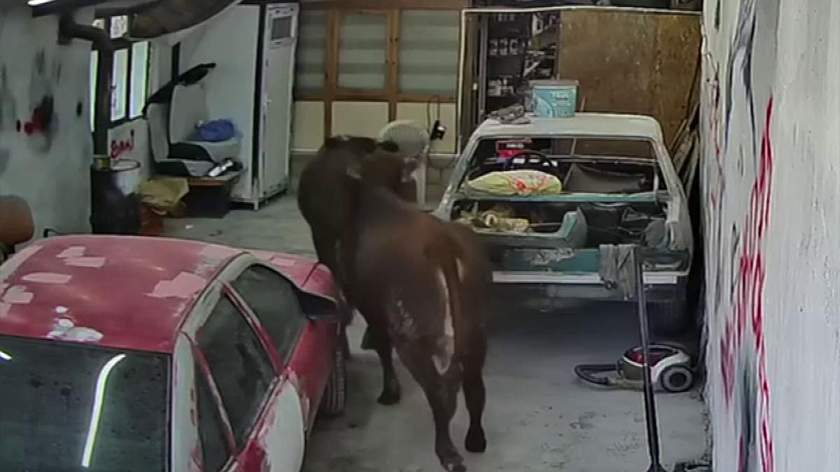 Elmadağ ilçesinde ahırdan kaçan kurbanlık danalar, bir anda koşarak oto tamirciye girdi. O esnada içeride bulunan çalışanlar korku dolu anlar yaşadı. Kısa süreli paniğe neden olan danalar, bir süre sonra iş yerinden çıktı. O anlar ise iş yerinin güvenlik kamerasına yansıdı.