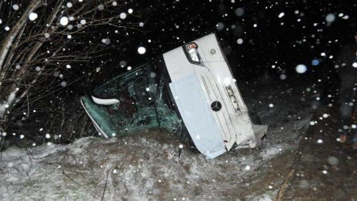 Eyüp KELEBEK/ ESKİŞEHİR, Kaza, saat 23.00 sıralarında Eskişehir-Kütahya karayolunun 25'inci kilometresindeki Nemli Köyü yakınlarında meydana geldi. İzmir'den gelen Mustafa Tunçay yönetimindeki 64 AN 120 plakalı otobüs, yoğun kar yağışı nedeniyle görüş mesafesinin azalmasıyla yoldan çıkıp şarampole devrildi. Kazayı otobüsün şoförü Mustafa Tunçay yara almadan atlattı. Çeşitli yerlerinden yaralanan 13 kişi yoldan geçen başka bir otobüs ve olay yerine gelen 112 ambulanslarıyla Eskişehir Osmangazi Üniversitesi Tıp Fakültesi, Yunus Emre Devlet ve Eskişehir Devlet hastanelerine götürüldü. Tedaviye alınan yaralıların sağlık durumlarının iyi olduğu öğrenildi. Kazayla ilgili başlatılan soruşturmanın sürdüğü belirtildi.