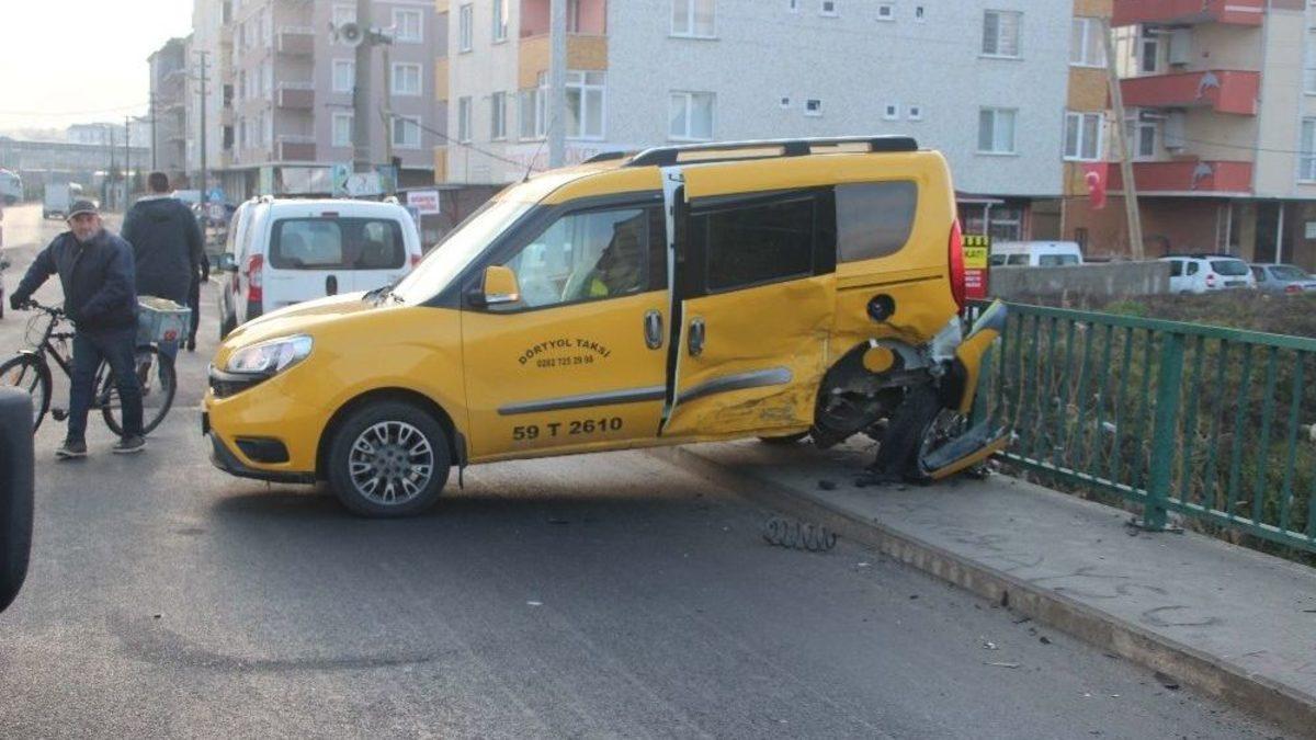 Tekirdağ’ın Çerkezköy ilçesinde kontrolden çıkan otomobil, ticari taksiye ardından 2 kişiye ardından park halindeki bir tıra çarptı. Ticari taksinin dereye düşmekten kıl payı kurtulduğu kazada 2 kişi yaralandı.Edinilen bilgiye göre kaza, Hükümet Caddesi üzerinde meydana geldi. Altıyol kavşağı istikametine giden Gülay U. yönetimindeki 34 HH 600 plakalı otomobil, sürücüsünün direksiyon hakimiyetini kaybetmesi sonucu karşı yönden gelen Sezgin Koru (44) yönetimindeki 59 T 2610 plakalı ticari taksiye, ardından kimliği belirlenemeyen Suriye uyruklu kağıt toplayıcıya, kaldırımda yürüyen Resul Saruhan’a (63)’a son olarak 42 AOA 94 plakalı park halindeki tıra çarptı. Çarpmanın etkisiyle sürüklenen ticari taksi, köprü üzerindeki korkuluklara çarparak dereye düşmekten kıl payı kurtuldu.Kazada kimliği belirlenemeyen Suriye uyruklu kağıt toplayıcı ve Resul Saruhan yaralandı. Yaralılar, çevredekilerin haber vermesiyle gelen sağlık ekipleri tarafından ambulansla Çerkezköy Devlet Hastanesi’ne kaldırıldı. Kazada iki otomobilde hasar gördü. Polis, kazayla ilgili soruşturma başlattı.