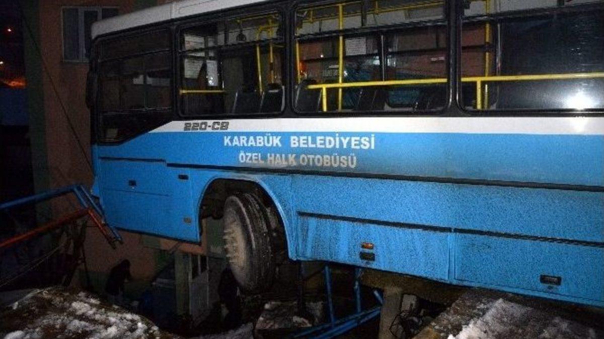 Karabük’te özel halk otobüsü iki katlı bir evin yanındaki korkuluklarını kırarak havada asılı kaldı.Edinilen bilgiye göre, 5000 evler - Yaylacık seferini yapan Halit Çoban idaresindeki 78 AD 700 plakalı özel halk otobüsü, Hacı Alay Caddesi üzerinde aşağıya indiği sırada önüne çıkan otomobile çarpmamak için frene basınca içinde yolcusuyla birlikte kayarak iki katlı evin yanındaki korkulukları kırarak duvarda asılı kaldı. Facianın kıl payı atlatıldığı kazada Halk otobüsü eve çarpmasına ramak kala havada asılı kalırken kazada yaralanan olmadı. Halk otobüsü şoförü Halit Çoban, “Önümüze bir anda otomobil çıktı çarpmamak için fren yaptık ve kaydık. Otobüste yolcular vardı, herkesi indirdik. Kimsede bir şey yoktu” dedi.Halk otobüsü olay yerine gelen vinç yardımı kaldırılırken, polis ekipleri kazayla ilgili soruşturma başlattı.