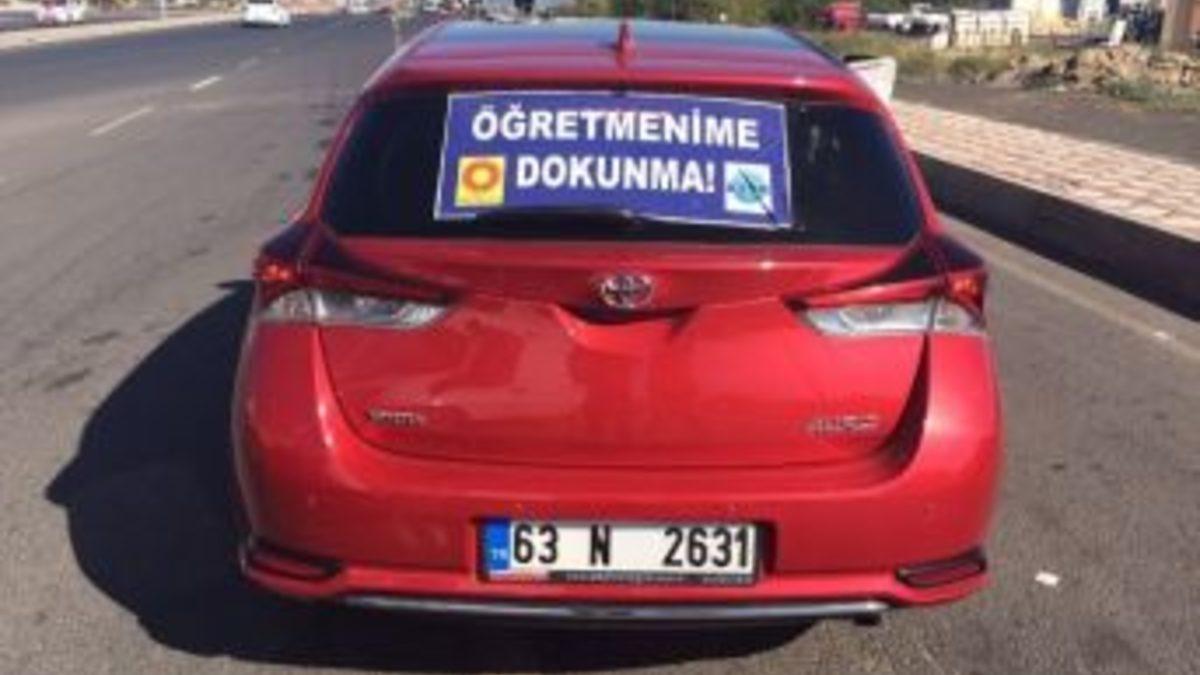 Diyarbakır’da otomobilinin arkasına “Öğretmenime dokunma” afişi asan bir kadın gözaltına alındı.Edinilen bilgilere göre, Şanlıurfa’dan Diyarbakır’a gelen 63 N 2631 plakalı otomobil, arka camına asılı bulunan “Öğretmenime dokunma” afişi nedeniyle kent girişindeki uygulama noktasında durduruldu. Araçta arama yapan polis, araç sürücüsü A.Ö. isimli kadını gözaltına alarak, Emniyet Müdürlüğü’ne götürdü.