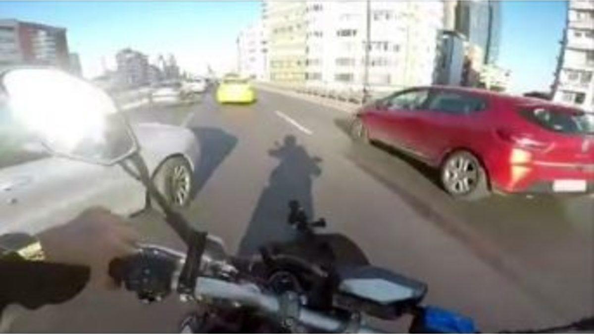 E-5 karayolu Mecidiyeköy mevkiinde seyir halinde olan otomobil sürücüsü, aniden duran trafikte frene basınca kontrolünü kaybederek motosikletliye çarptı. Kaza anı kask kamerasına yansırken, motosikletli ise ölümden döndü.Kaza, geçtiğimiz Pazartesi günü öğle saatlerinde E-5 karayolu Mecidiyeköy mevkii Ankara istikametinde meydana geldi. Edinilen bilgiye göre öğle saatlerinde bir genç, motosikletliyle seyir ettiği esnada karayolundaki trafik bir anda durdu. Trafiğin aniden yavaşladığını geç fark eden otomobil sürücüsü ise frene bastı. Sürücüsünün kontrolünden çıkan otomobil, şerit değiştirdi. Orta şeride giren otomobil motosiklete çarptı. Olayda kısa sürede direksiyon hakimiyetini sağlayan motosikletli, ölümden kıl payı kurtuldu. O anlar ise kask kamerasına saniye saniye yansıdı."Az kalsın beni öldürüyordun"Kaza sonrası motosikletlini emniyet şeridine park ederek duran trafikte otomobile doğru yürüyen genç, sürücüye "Az kalsın beni öldürüyordun" diyerek tepki gösterdi. Sürücü ise önündeki aracın bir anda durdurduğunu söyleyerek kendini savundu. Taraflar, daha sonra araçlarına binerek olay yerinden ayrıldı.