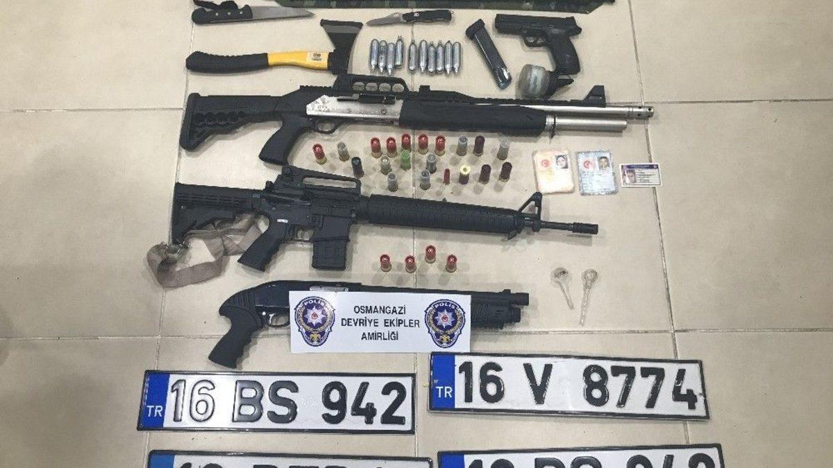 Bursa’da, çocukların, "Annemi öldürecekler" ihbarı üzerine operasyon yapan polis, cephanelik gibi bir otomobil ele geçirdi. 3 kişinin gözaltına alındığı otomobilden 3 tüfek, gaz tabancası, balta ve çok sayıda fişekle sahte ve çalıntı plakalar çıktı.Edinilen bilgiye göre, dün gece 155 hattına kadına şiddet ihbarı geldi. Ekipler, ihbarın yapıldığı Hacıilyas Mahallesi’ne geldiğinde, sokağın başında park etmiş bir araca rastladı. Araçtaki N.T.(38), K.A. (39) ve M.D. (36) ile bir kişi polis ekiplerini görünce araçtan inerek farklı yerlere kaçmaya başladı. Sokakta bulunan bir binaya giren K.A, eski eşinin evine girmeye çalışınca, çocukları, ’Annemi öldürecekler, lütfen yardım edin’ diye balkondan bağırarak yardım istedi. Bölgeye gelen çok sayıda polis ekibi, ayrıldığı eşinin evine zorla giren K.A.’yı ikna ederek gözaltına aldı. Araçtan inen N.T. ve MD. de kısa sürede yakalandı..Aracı inceleyen polis, adeta bir cephanelikle karşılaştı. Araçtan 3 adet farklı tüfek, bir adet gaz tabancası, bir adet balta ile çok sayıda fişek ve 2 adet sahte plaka ve bir adet çalıntı plaka ele geçirildi. Kaçan şahıslardan birinin üzerinden ise bir adet tabanca ile uyuşturucu madde kullanımına yarayan aletler ele geçirildi. 3 şahıs gözaltına alınırken, kayıplara karışan bir kişi aranıyor.K.A.’nın eski eşi H.A’yı (34) görmeye geldiği öğrenildi. Zanlılar sağlık kontrolünün ardından ifadeleri alınmak için karakola götürüldü.