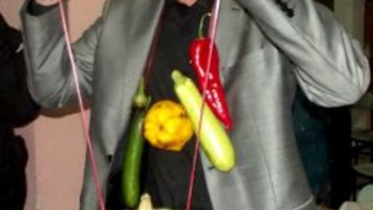 Damadın bir süre boynundaki sebzeleri çıkarmasına izin vermeyen arkadaşları, kahkahalar eşliğinde salonda göbek atarken, damat da bir süre boynundaki sebzelerle oynamak zorunda kaldı.