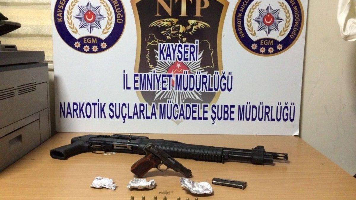 Kayseri’de Narkotik Suçlarla Mücadele Şube Müdürlüğü ekiplerinin Özel Harekat Polisi destekli 5 adrese eş zamanlı yaptığı operasyonda 17 şahıs yakalandı.Edinilen bilgiye göre, Kayseri Emniyet Müdürlüğüne bağlı Narkotik Suçlarla Mücadele Şube Müdürlüğü ekipleri tarafından uyuşturucu madde ticareti yapan zanlılara yönelik Özel Harekat Polislerinin de destek verdiği operasyon gerçekleştirildi. Şehir merkezindeki 5 adrese eş zamanlı yapılan operasyonda, zanlıların bulunduğu evlerin çelik kapıları koçbaşı ile kırılarak içeri girildi. Polis ekiplerinin evlerde yaptığı aramalarda metamfetamin, 2 adet tabanca, bir adet pompalı tüfek ele geçirilirken, 17 zanlı ise yakalandı.Yakalanan şahıslardan 15’i hakkında uyuşturucu madde kullanmaktan işlem yapılırken, B.P. (44) ve C.S. (40) hakkında uyuşturucu madde ticareti yapmaktan işlem yapıldığı kaydedildi.