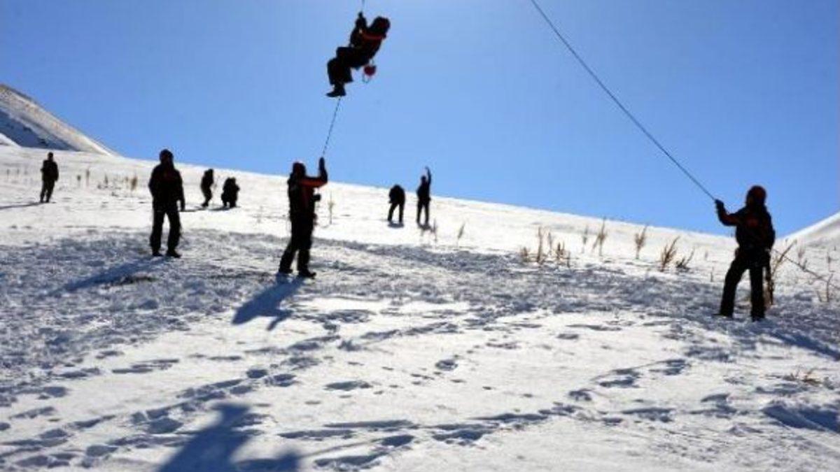 Turgay İPEK/ERZURUM, Palandöken’in 2 bin 200 rakamındaki karakolda konuşlandırılan tam donanımlı 7 kişilik JAK timi tatbikatta ilk olarak gelen ihbar üzerine güney pistindeki telesiyejde mahsur kalan kayakçının imdadına yetişti. 3 kar motosikleti ile harekete geçen JAK timi, 11 kilometre uzaklıktaki güney pistinde mahsur kalan kayakçının yanına 3 dakikada ulaştı. Dağcı eğitimi alan JAK timleri halatlar atarak 2 dakika içinde telesiyejde mahsur kalan kayakçıyı halatlarla indirerek kurtardı. Timler daha sonra çığ altında kalan iki kayakçıyı aramaya başladı.