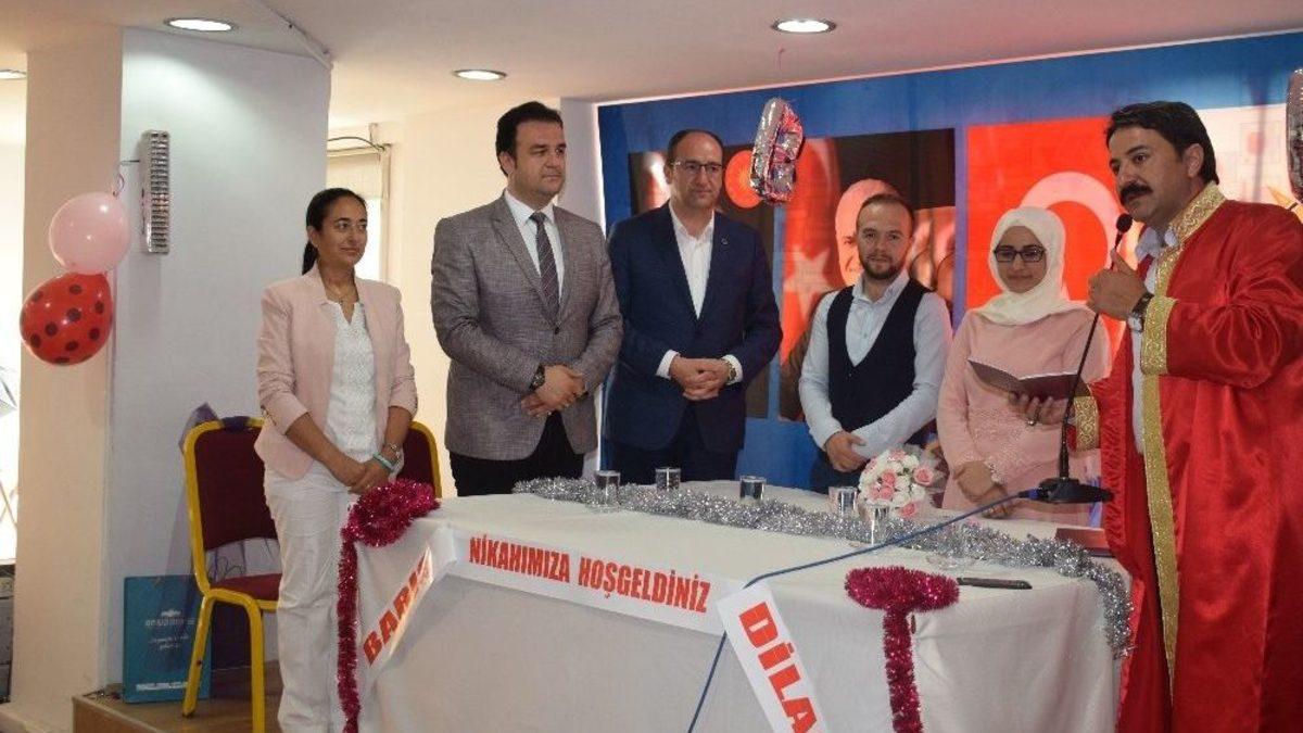 AK Parti Eskişehir İl Teşkilatı’nda tanışan ve daha sonra evlenmeye karar veren çiftin nikahı parti binasında kıyıldı.AK Parti İl Başkanlığı’nın toplantı salonu bu kez bir nikah için doldu. Sürekli parti toplantılarının yapıldığı salonda; AK Parti Tepebaşı Kadın Kolları Başkan Yardımcısı Av. Dilara Akdağ ve teşkilat mensubu Barış Kocaoğlu’nun nikah töreni için toplanıldı. Seyitgazi Belediye Başkanı Hasan Kalın’ın kıydığı nikahın şahitleri İl Başkanı M. Dündar Ünlü, Tepebaşı İlçe Başkanı İbrahim Yılmaz Kaynarca ve Tepebaşı İlçe Kadın Kolları Başkanı Neşe Karademir oldu.Parti teşkilatından ve aile yakınlarından konukların katıldığı nikahta konuşan M. Dündar Ünlü, “Bu salonda birçok toplantıya, mutlu anlara ve ciddi çalışmalara şahit olduk. Bugün de, aynı zamanda bir ilk olarak da iki güzide teşkilat mensubumuzun mutlu gününe şahitlik ediyoruz. Bu davaya gönüllerini vermiş kardeşlerime ömrü boyu mutluluk diliyor, ömürleri boyunca da davamıza gönül bağlılığı ile hizmete devam etmelerini temenni ediyorum” ifadelerini kullandı.Ünlü aynı zamanda, Cumhurbaşkanı Recep Tayyip Erdoğan’ın çocuk tavsiyelerini de yineledi. Gelin Avukat Dilara Akdağ ise, “Partide tanışıp evlenme kararı almıştık, davamıza gönül verdiğimiz bu mekanda birbirimize de söz verdik. Bu tercih için mutluyum. İl ve İlçe Başkanımıza, Kadın Kolları Başkanıma ve teşrif edenlere çok teşekkür ederim” dedi.