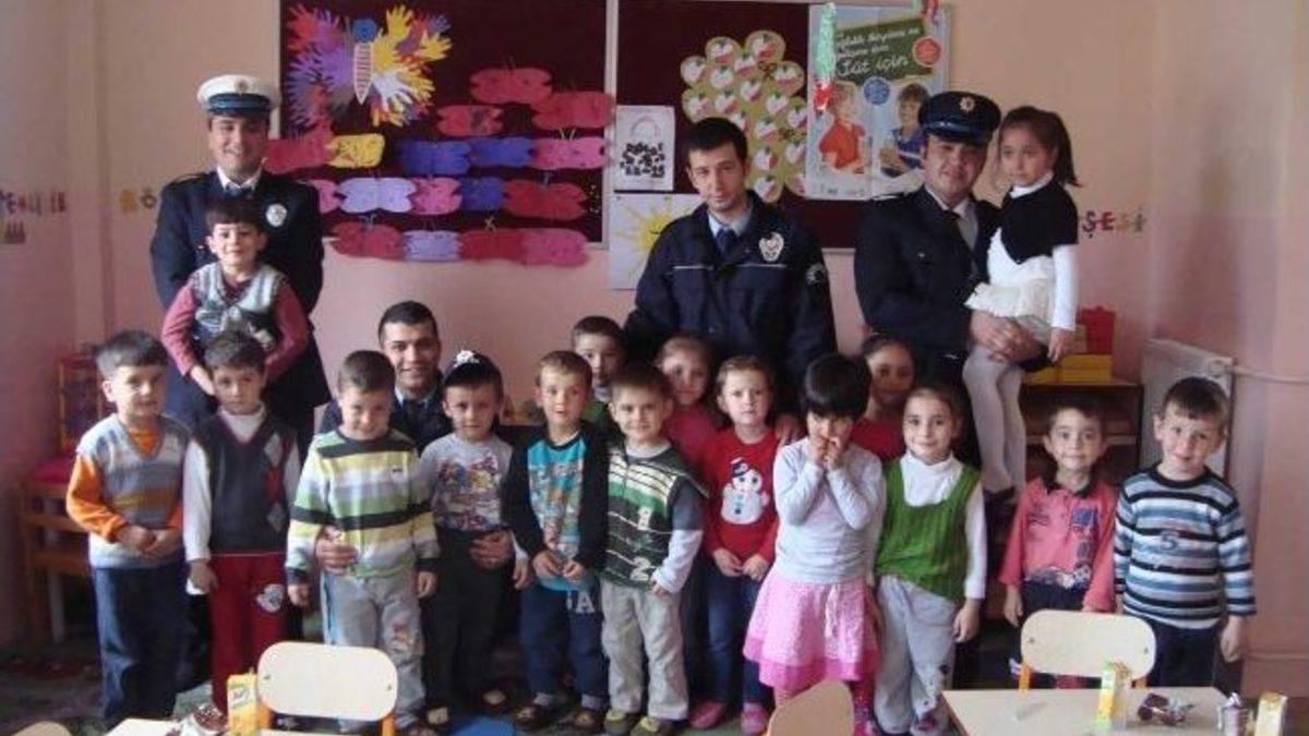 Kütahya'nın Pazarlar İlçesi Emniyet Amirliği'nde görevli polisler, Emniyet Teşkilatı'nın 168. kuruluş yıl dönümü münasebetiyle düzenlenen Polis Haftası kutlamaları çerçevesinde Pazarlar Anaokulu öğrencilerini ziyaret etti.