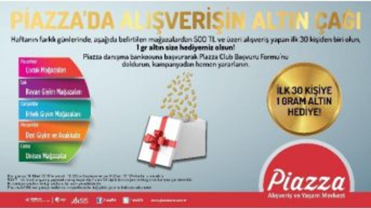 Piazza Alışveriş ve Yaşam Merkezi(AVYM), haftanın farklı günlerinde belirlenmiş mağazalardan 500 TL ve üzeri alışveriş yapan ilk 30 ziyaretçisine, 1 gram altın hediye edecek.Piazza AVYM, 16 - 20 Mart tarihleri arasında, haftanın farklı günlerinde belirlenmiş mağazalardan 500 TL ve üzeri alışveriş yapan ilk 30 ziyaretçisine 1 gram altın verecek.Piazza AVYM’den yapılan açıklamada, "Kampanya, belirtilen tarihler arasında pazartesi çocuk, salı bayan giyim, çarşamba erkek giyim, perşembe deri giyim ve ayakkabı, cuma unisex kategorisindeki mağazalardan yapılacak 500 TL ve üzeri alışverişler için geçerli olacak ve ilk 30 kişi 1 gram altın ödülünü almaya hak kazanacak. Kampanya katılmak için Piazza danışma bankosuna başvurmak ve Piazza Club Başvuru Formu’nu doldurmak yeterli olacak" denildi.