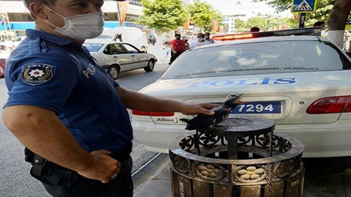 Malatya Emniyet Müdürlüğüne bağlı polis ekipleri, İnönü Caddesi üzerinde rutin görevine devam ederken, önlerine aniden yavru bir karga düştü. Kargayı yol üstünden alıp yüksek bir yere koyan polis memuru önce karga yaralandı mı diye kontrol etti, daha sonra ise susayan kargaya kendi suyunu verdi. Bir süre uçmaya çalışan yavru karganın yanından ayrılmayan polis memuru, karganın güvenli bir şekilde uçmasını sağladı.