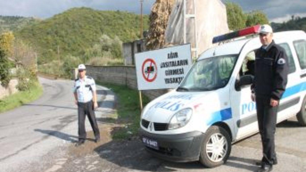Zonguldak’ın Ereğli ilçesinde trafik komisyonu kararı ile ağır tonajlı kamyonlara kapanan Bölücek Köprüsü'nde trafik polisleri...