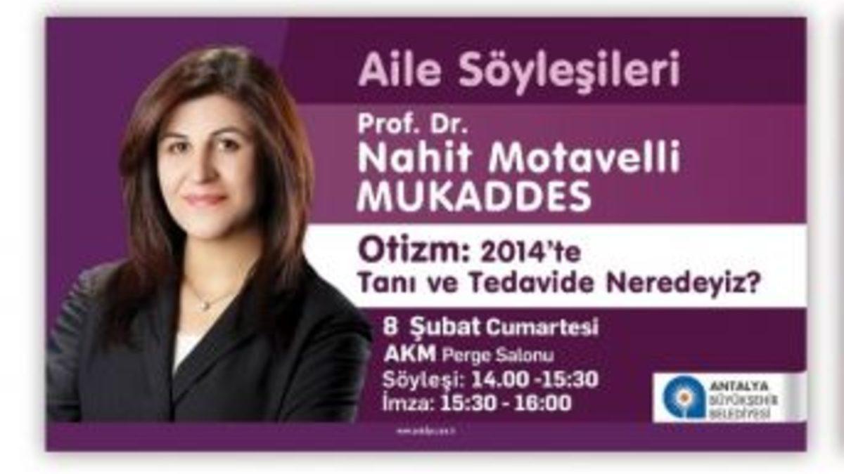 Antalya Büyükşehir Belediyesi ‘Aile Söyleşileri’ kapsamında Prof. Dr. Nahit Motavalli Mukaddes’i, 8 Şubat tarihinde AKM’de Antalyalılarla buluşturuyor.Antalya Büyükşehir Belediyesi Kültür ve Sosyal İşler Daire Başkanlığı’nın halkı bilgilendirmek ve aydınlatmak amacıyla düzenlediği söyleşi ve konferanslar devam ediyor. Prof. Dr. Nahit Motavalli Mukaddes, bu kapsamda “Otizm: 2014’te tanı ve tedavide neredeyiz” konulu söyleşi gerçekleştirecek.Prof.Dr. Mukaddes, Antalya Kültür Merkezi’ndeki (AKM) söyleşi sonrası kitaplarını imzalayacak. Söyleşiye tüm Antalyalıların davetli olduğu belirtildi.